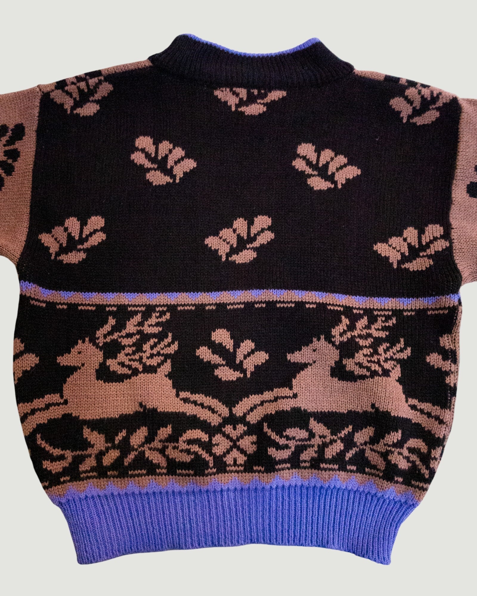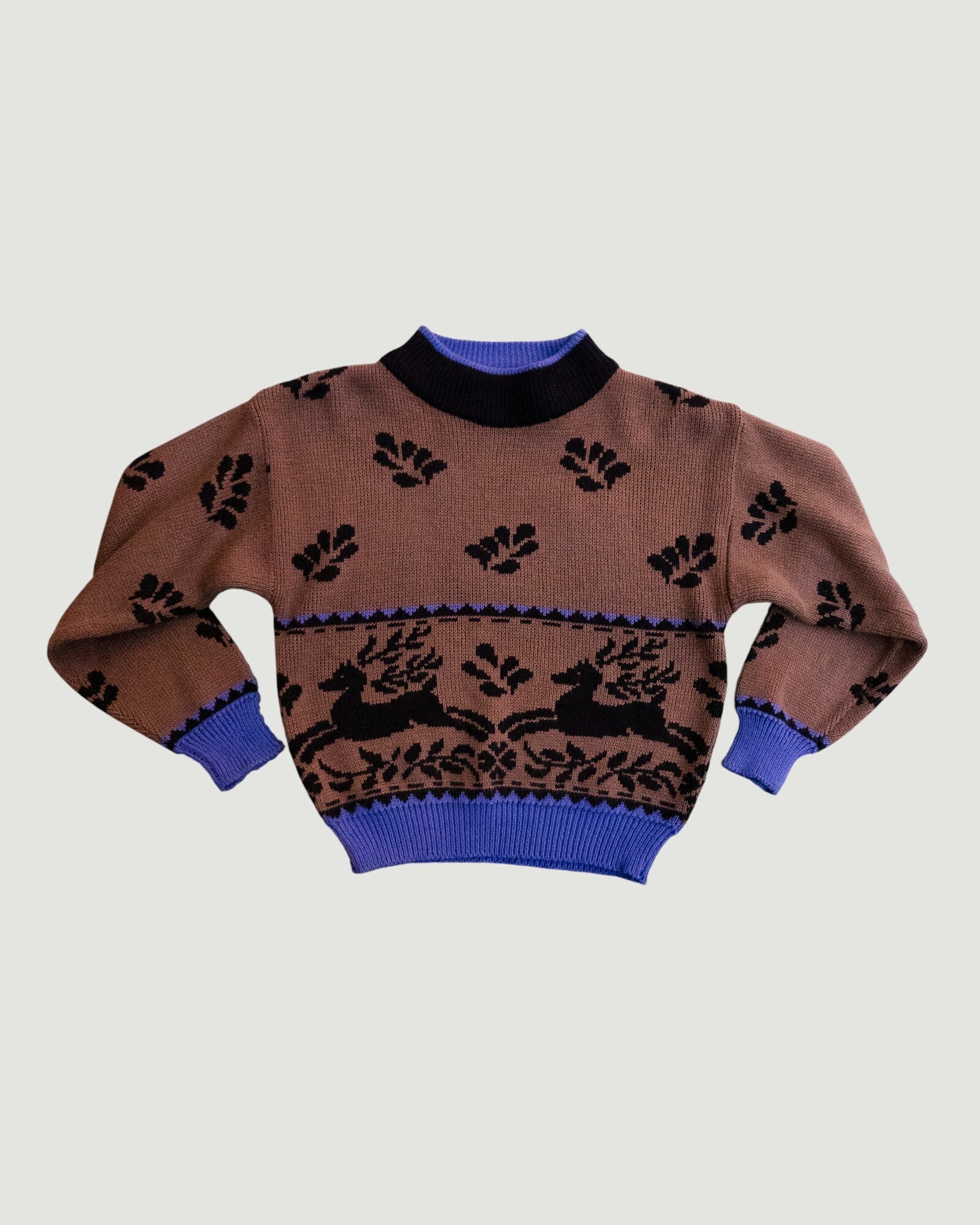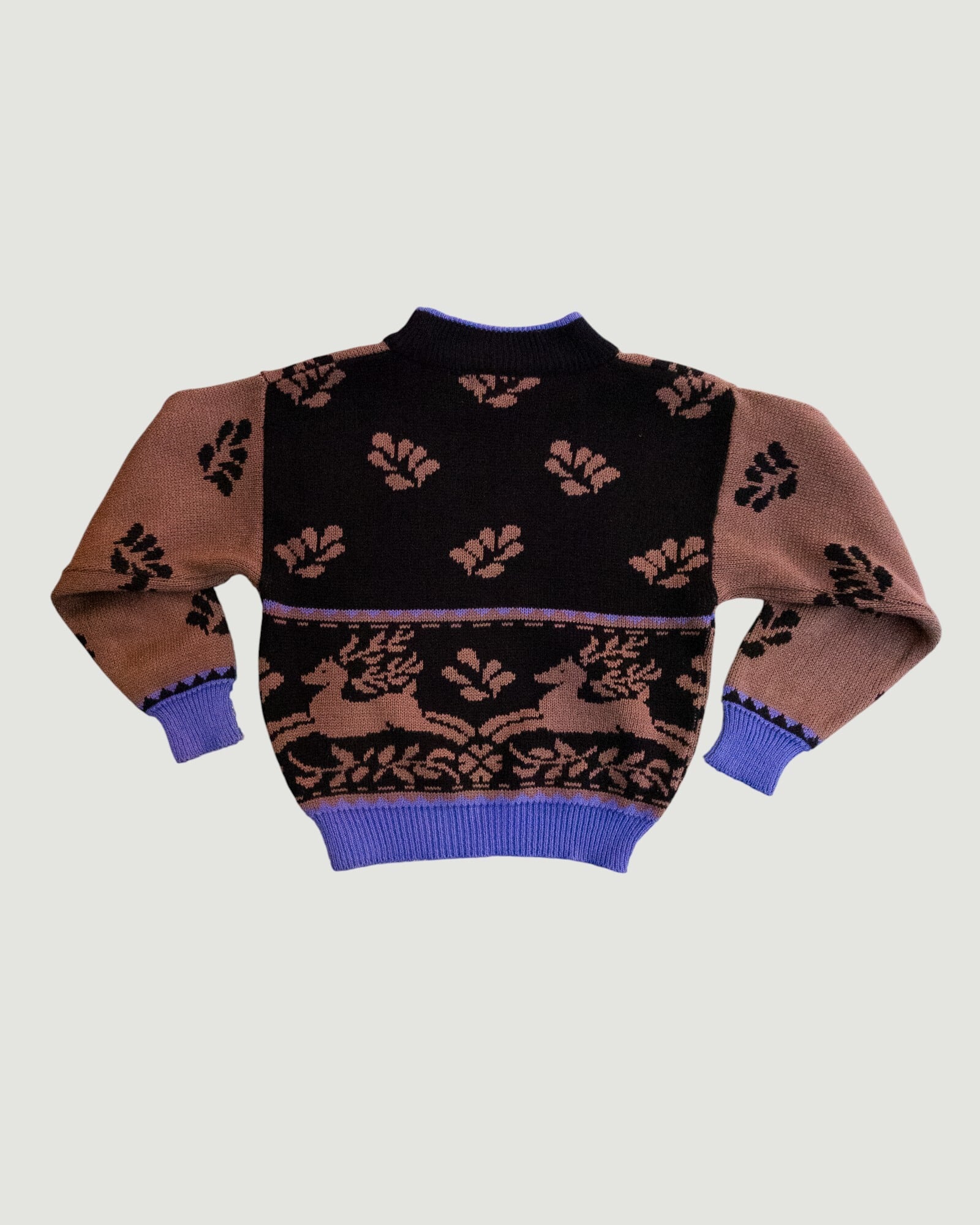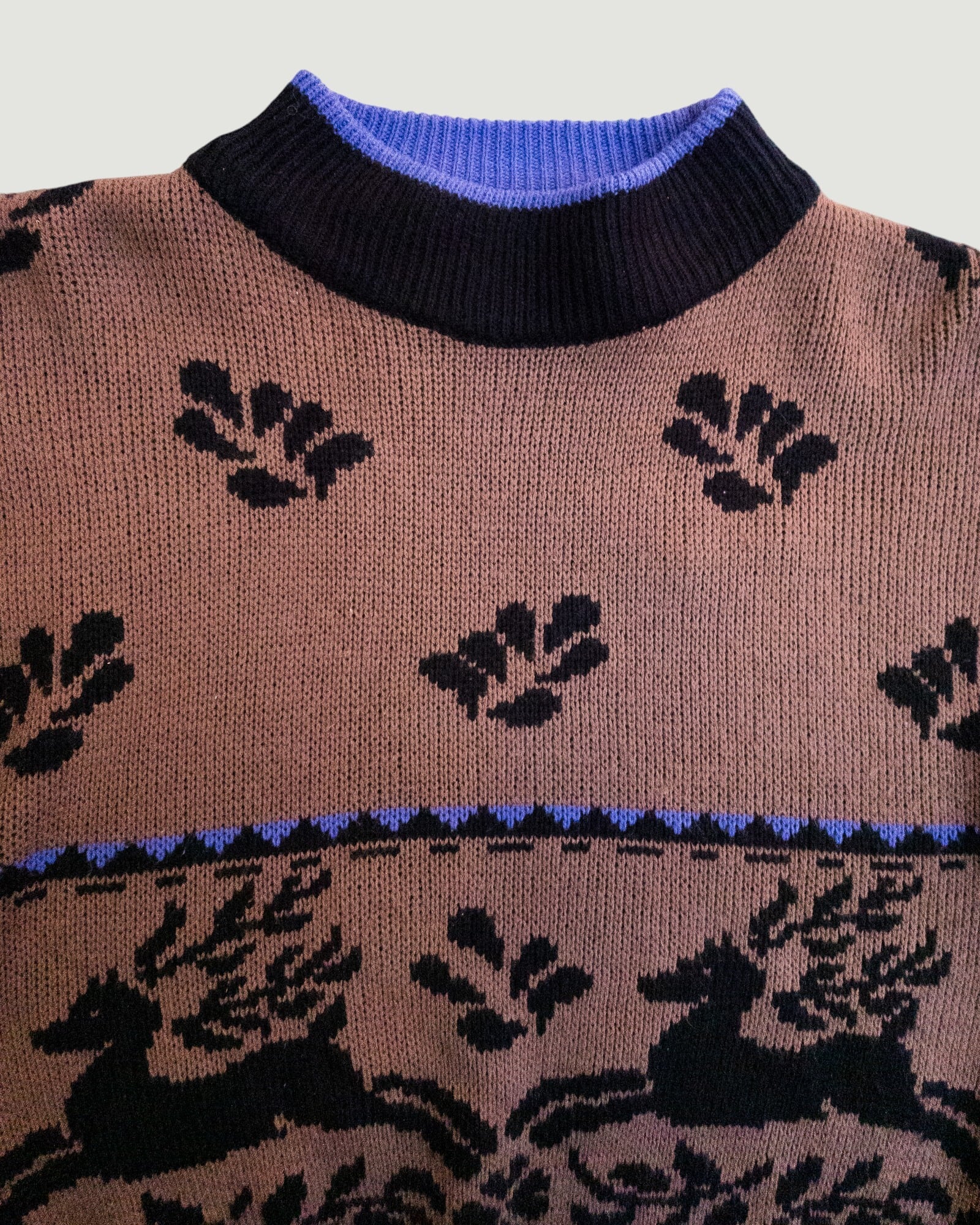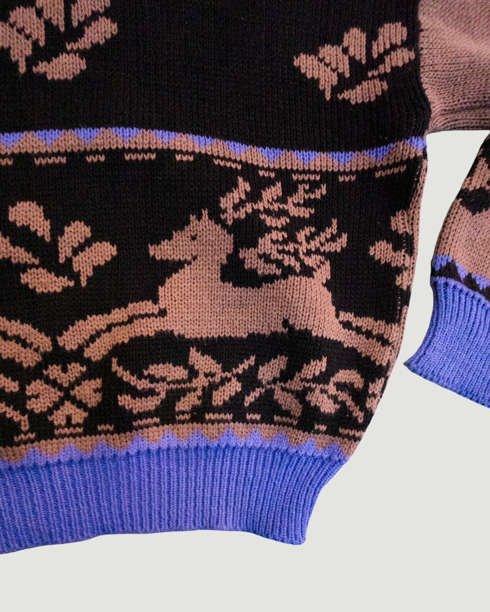 飛び跳ねる鹿とボタニカル柄が上品に描かれたセーター。