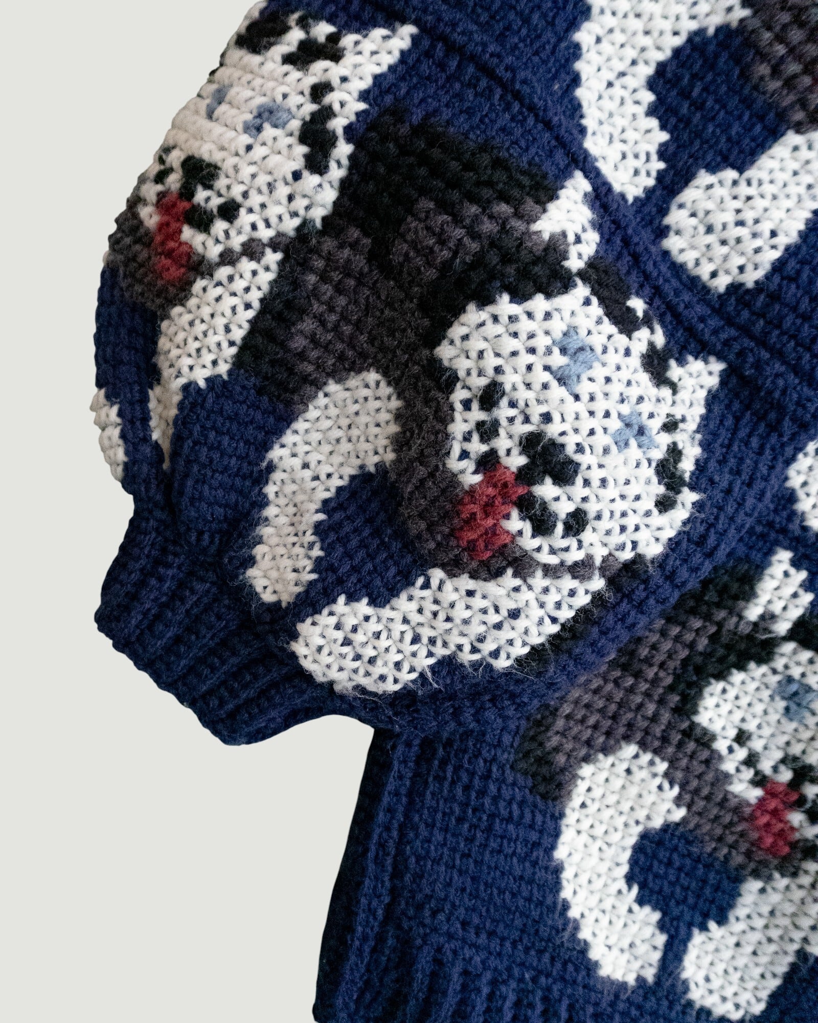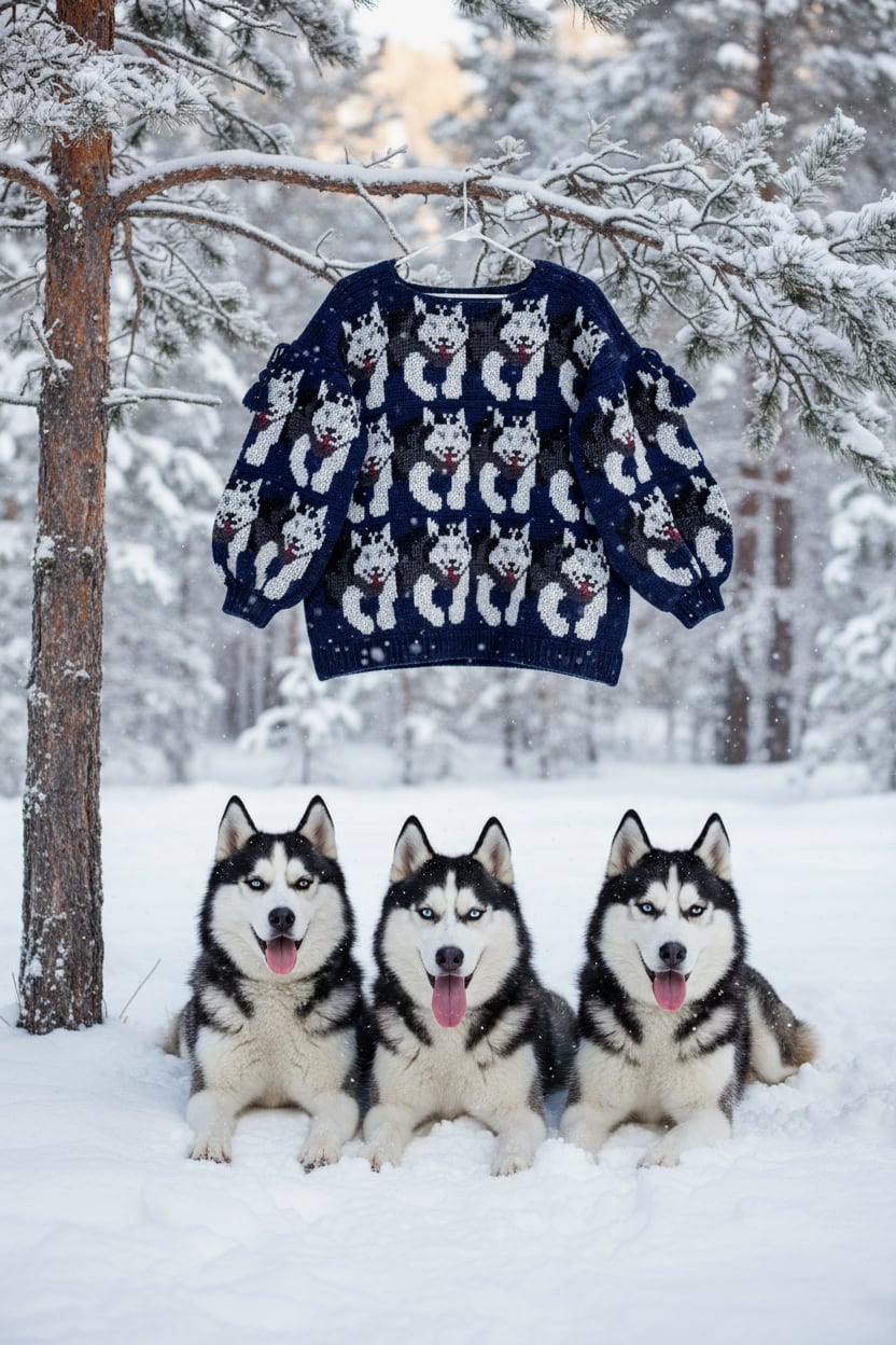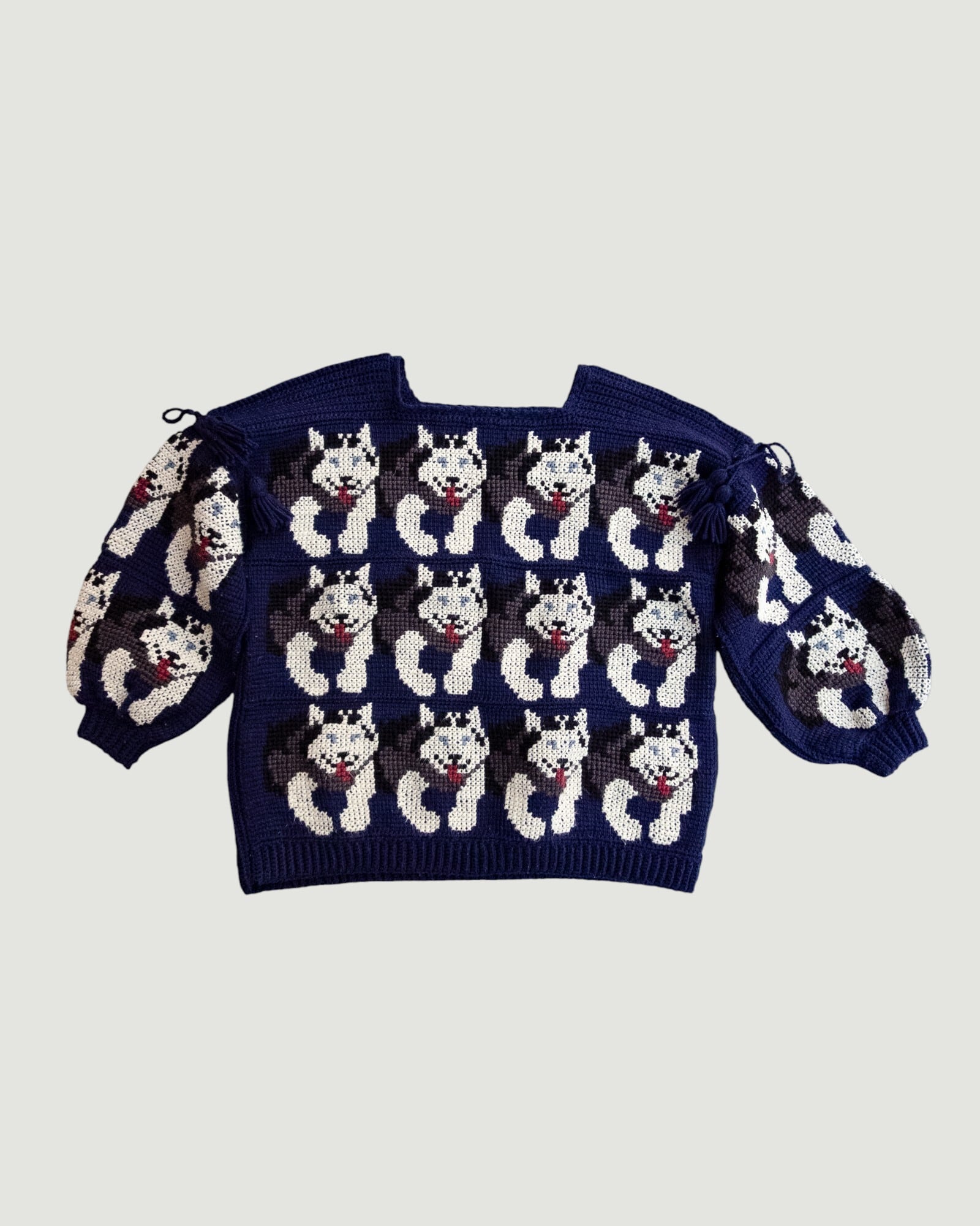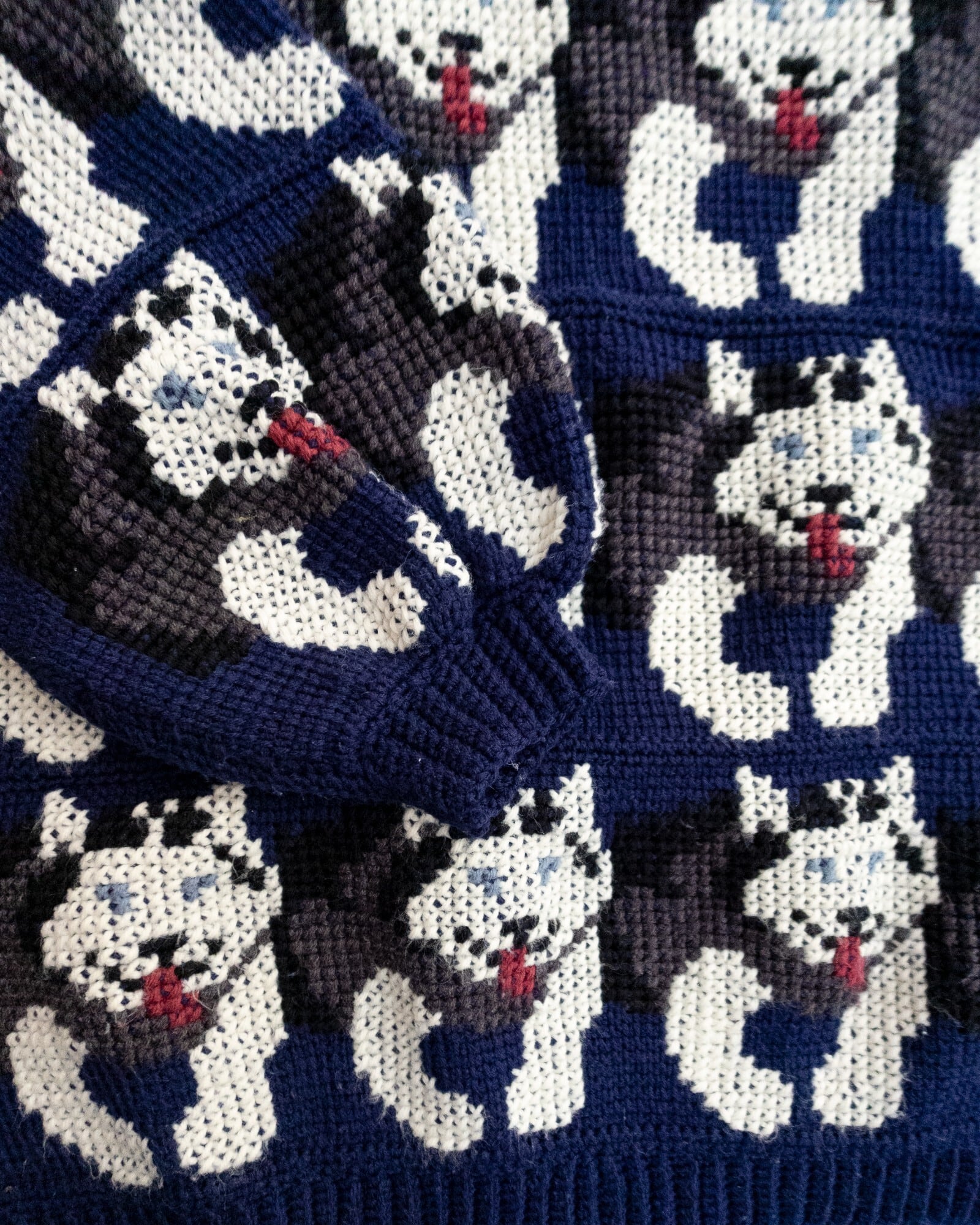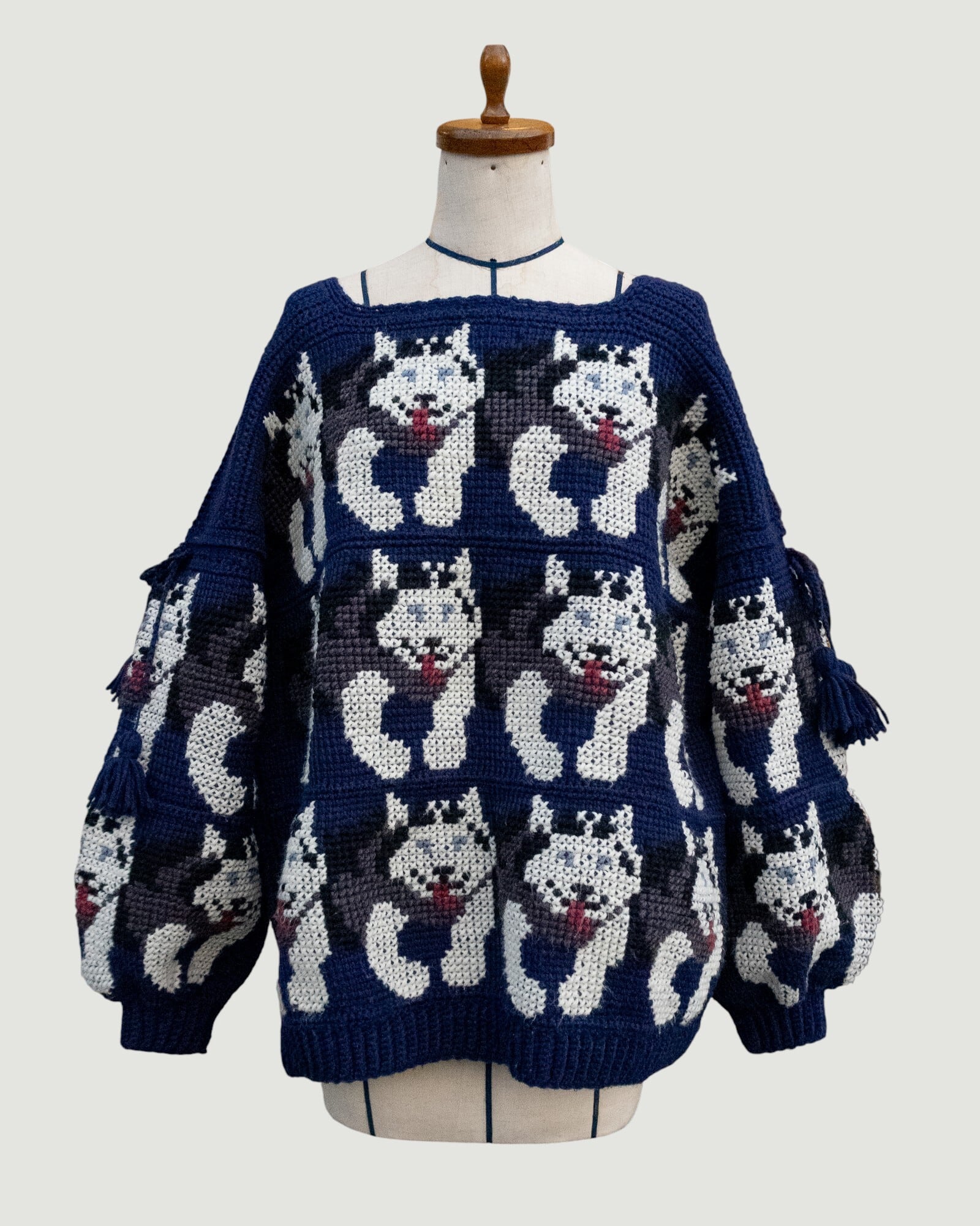 総勢36頭のシベリアンハスキーが、全面に編まれたインパクト大のセーター。