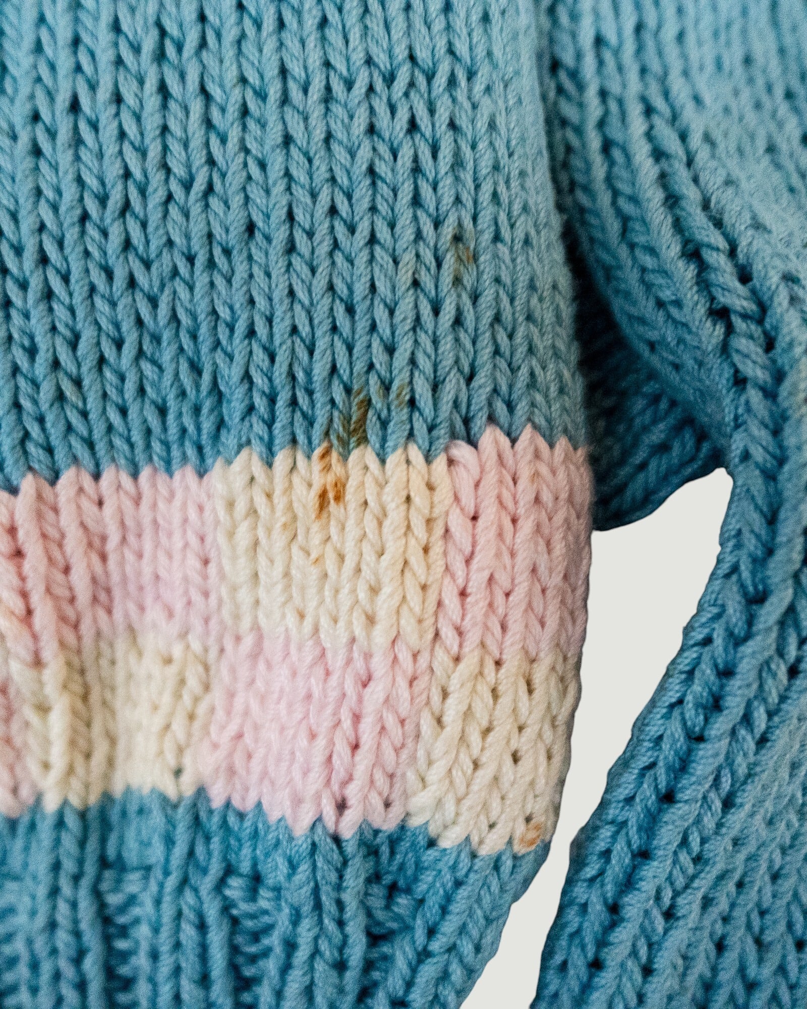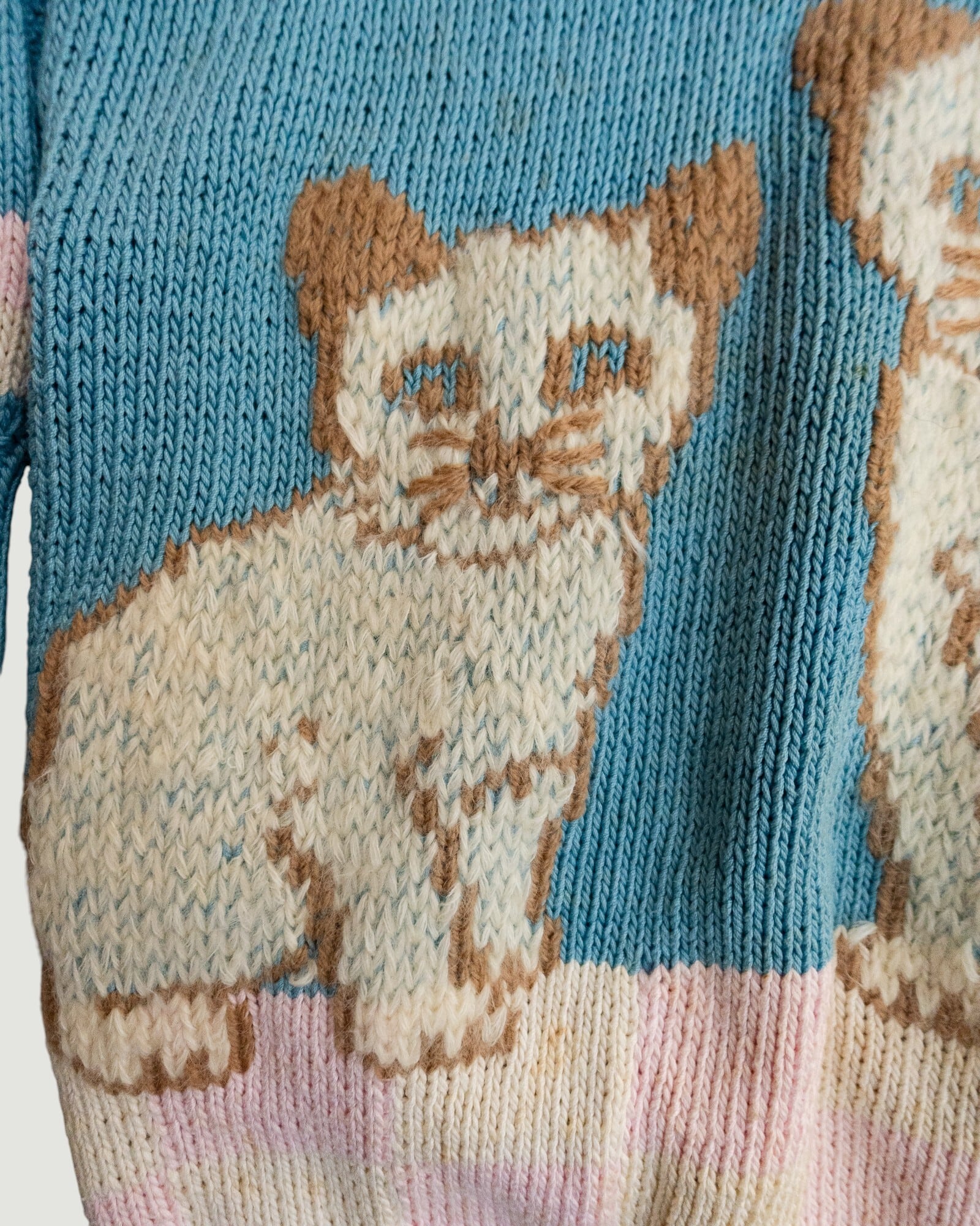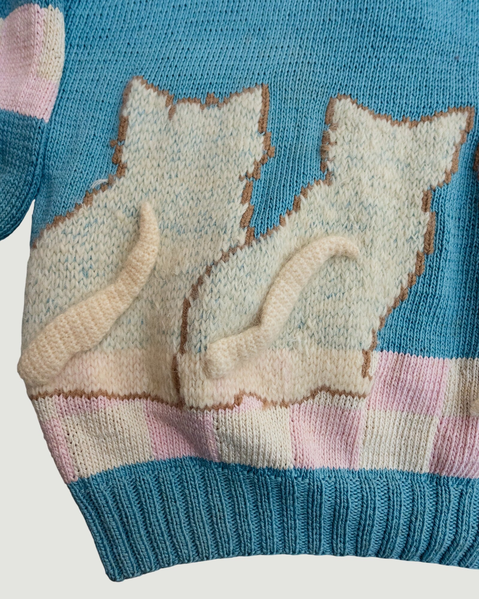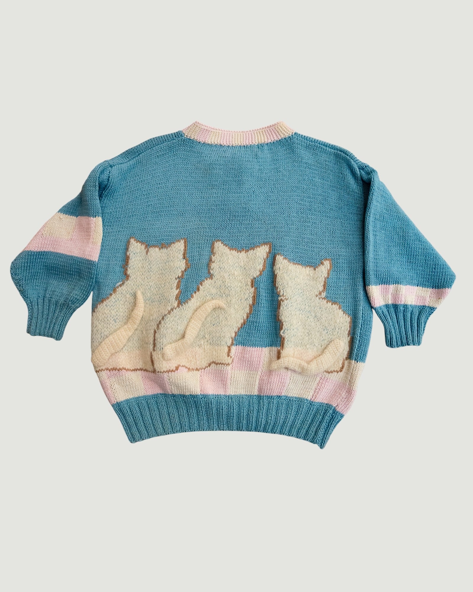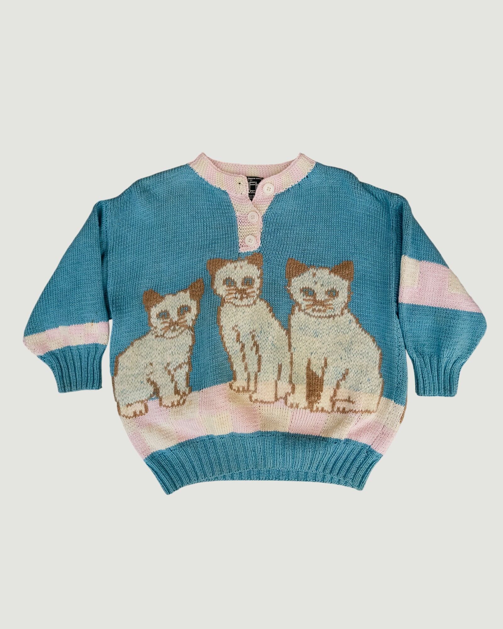 3匹の子猫の絵柄が編まれた手編みのコットンニット。