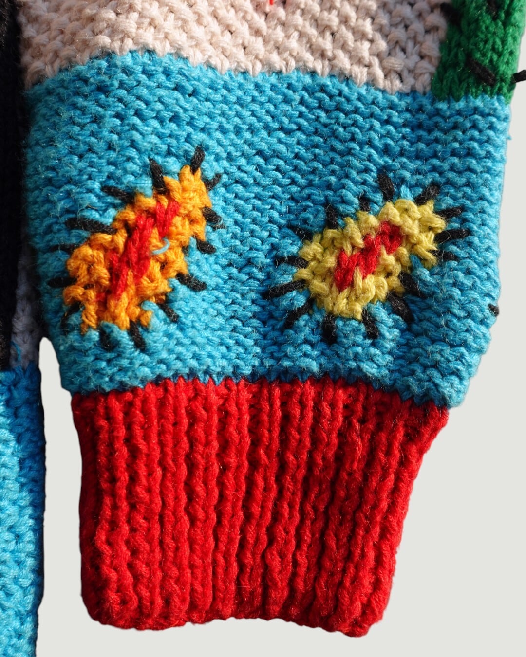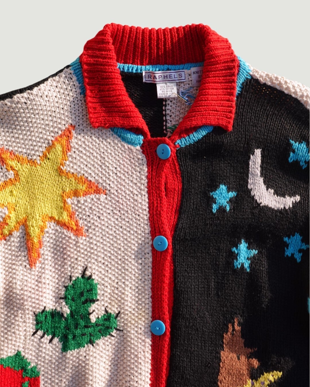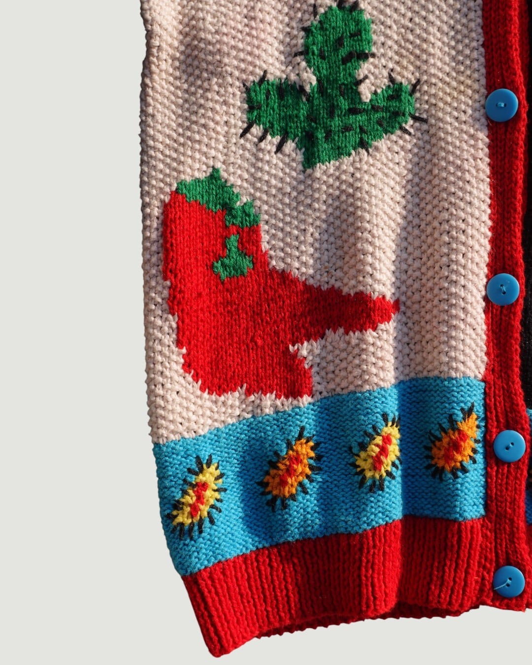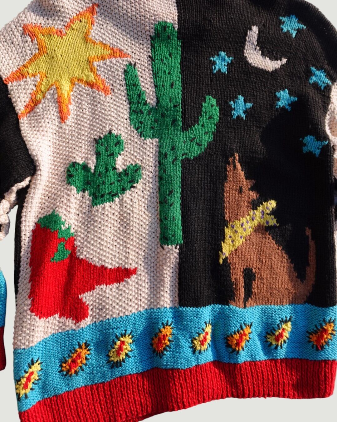 砂漠の風景のモチーフを、鮮やかな色使いでぎゅっと詰め込んだ手編みのカーディガンニットです。