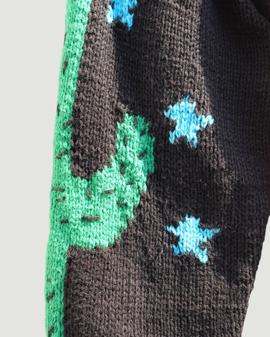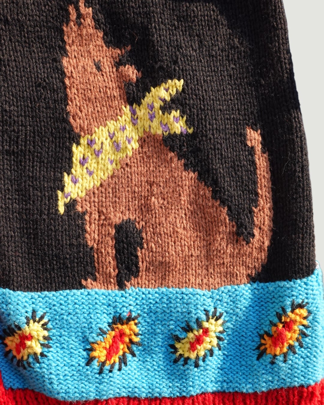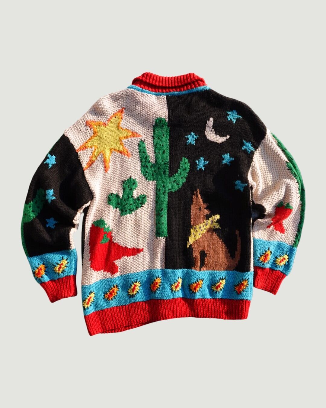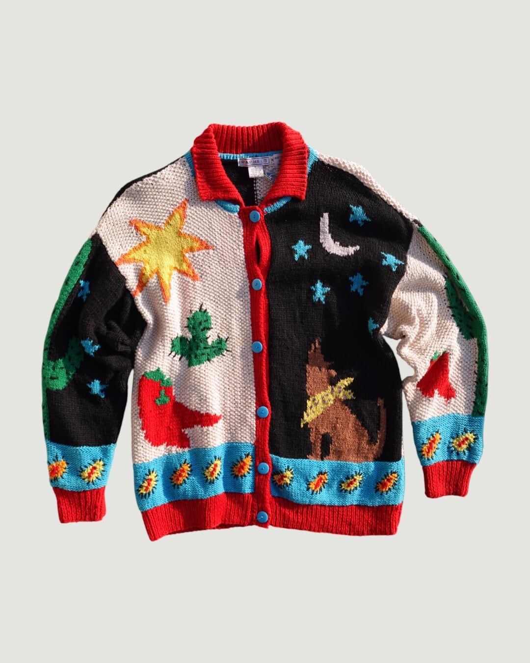 砂漠の風景のモチーフを、鮮やかな色使いでぎゅっと詰め込んだ手編みのカーディガンニットです。