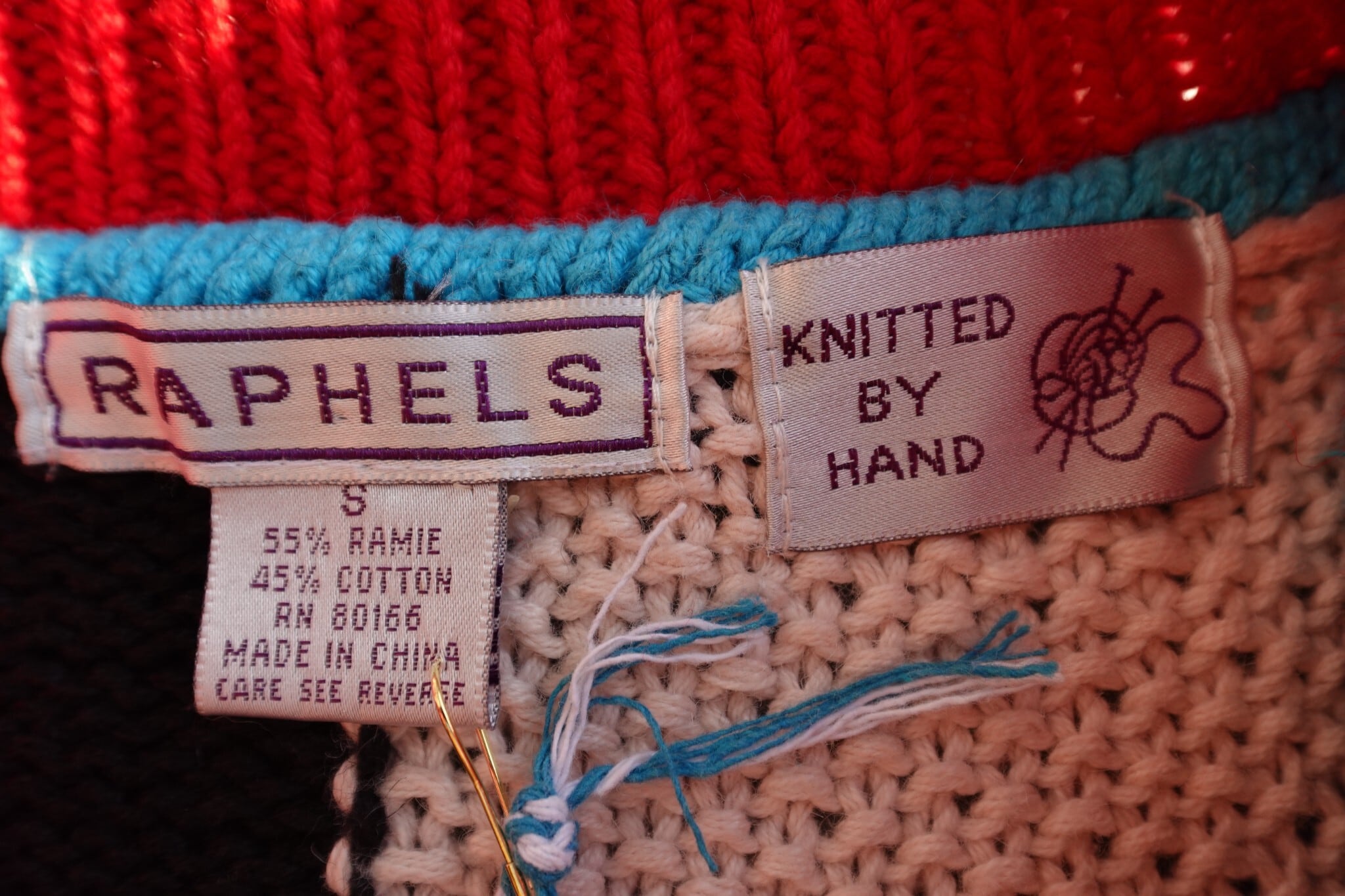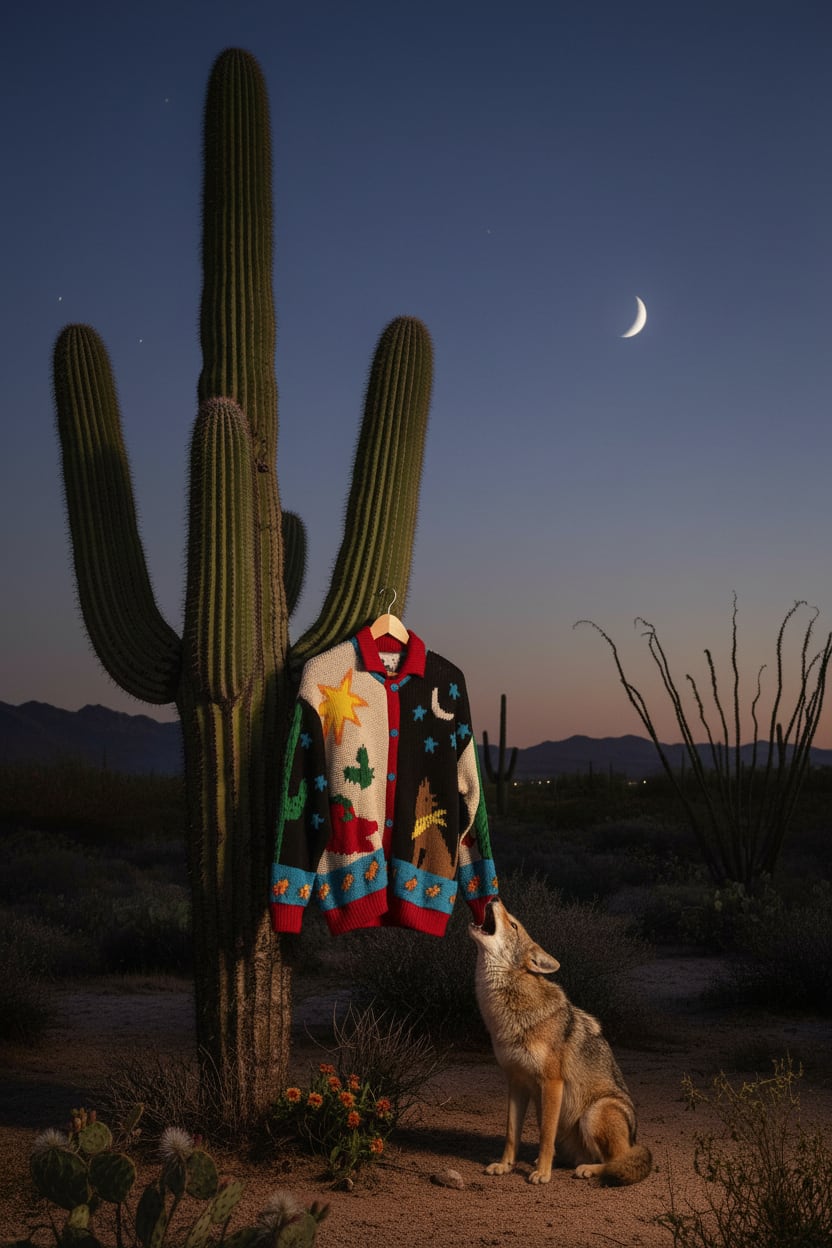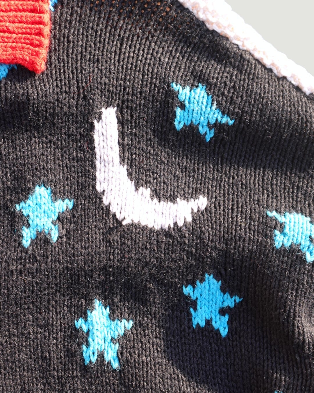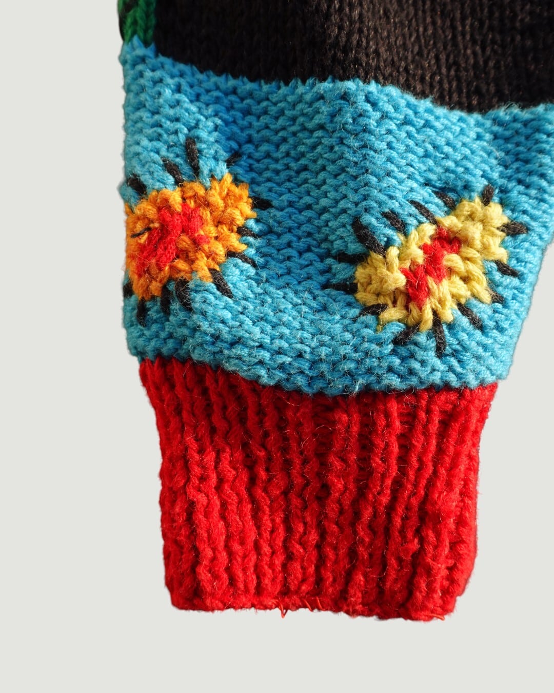 砂漠の風景のモチーフを、鮮やかな色使いでぎゅっと詰め込んだ手編みのカーディガンニットです。