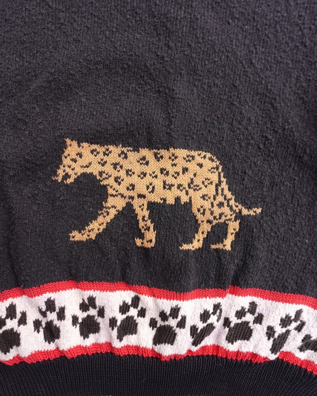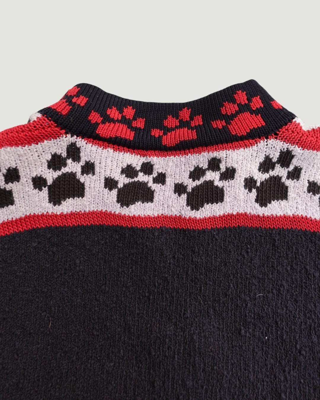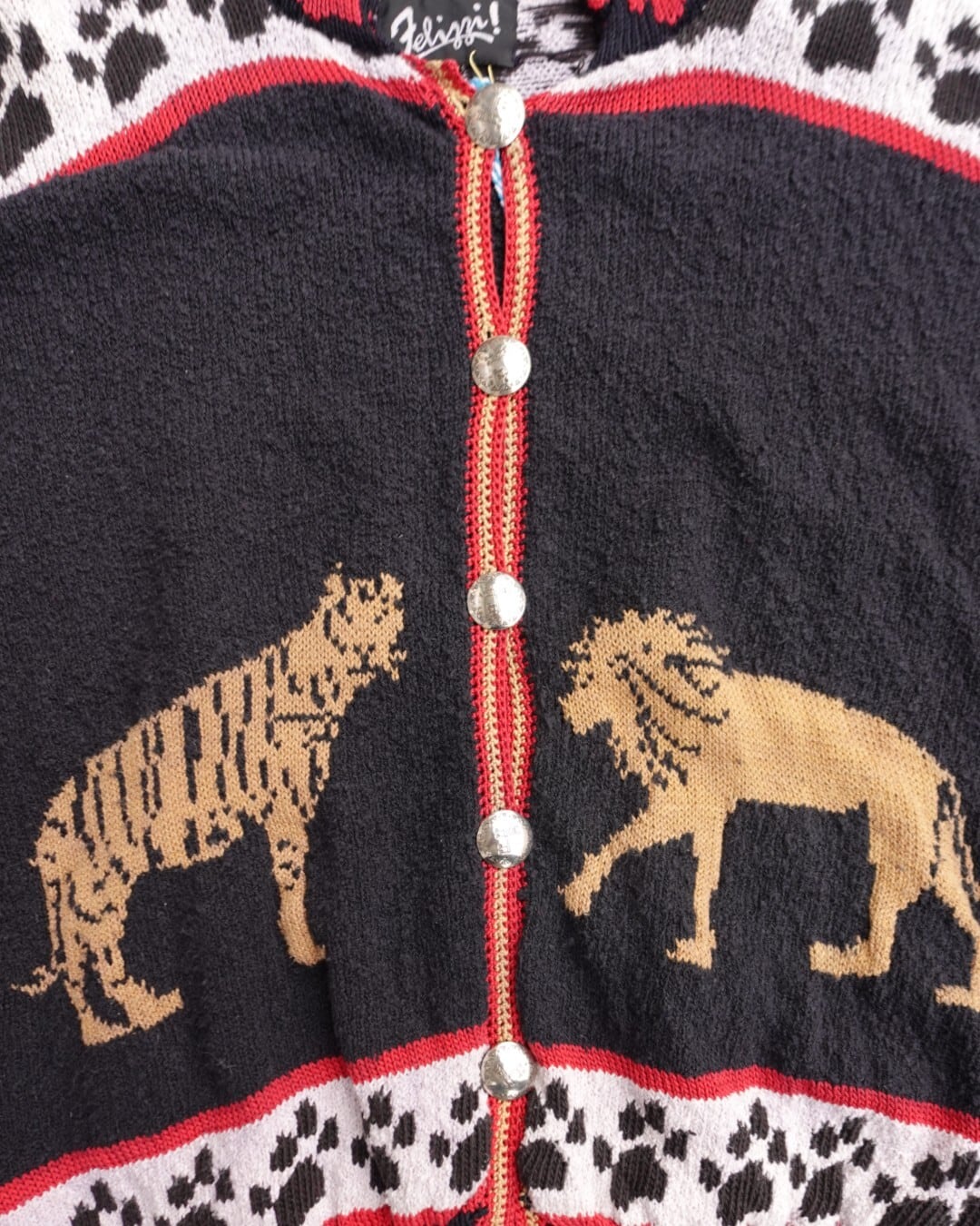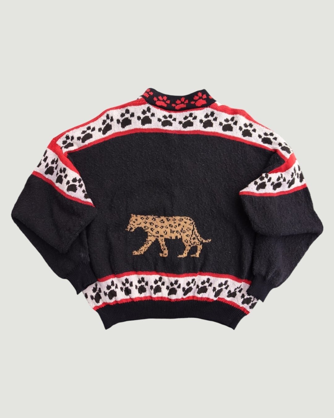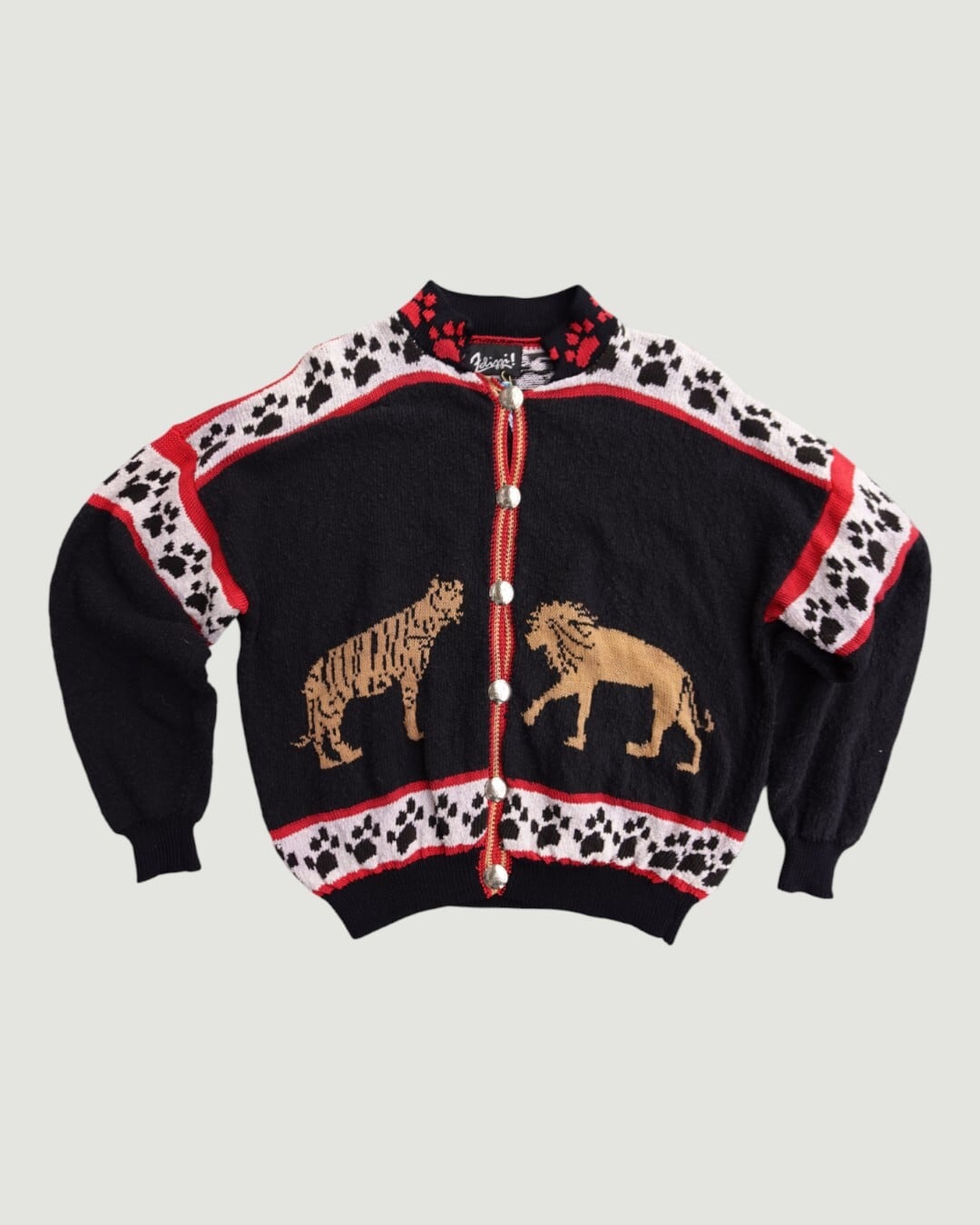 一見硬派なデザインに見えますが、虎の表情はどこかとぼけていて、袖や裾、襟には肉球モチーフ。強さとかわいさが同居した、不思議なバランスのカーディガンニットです。