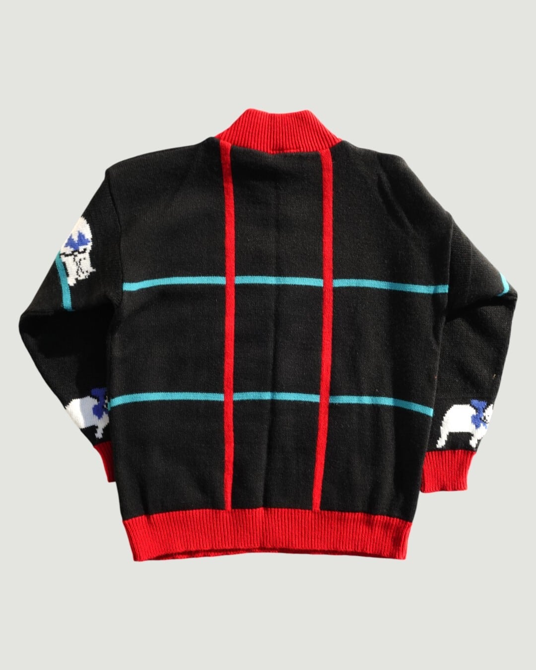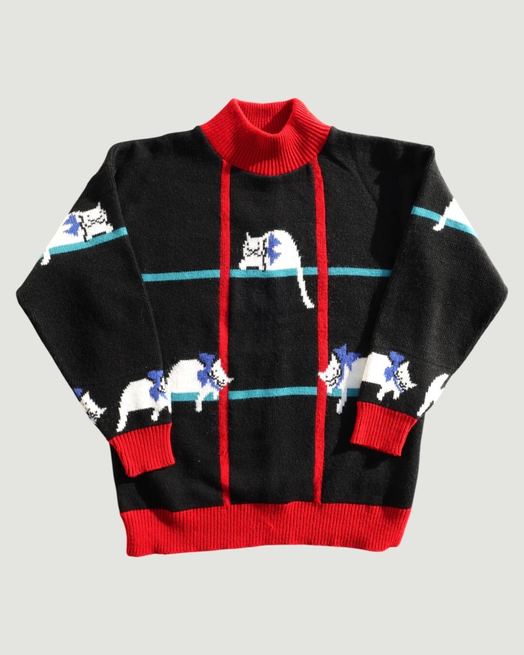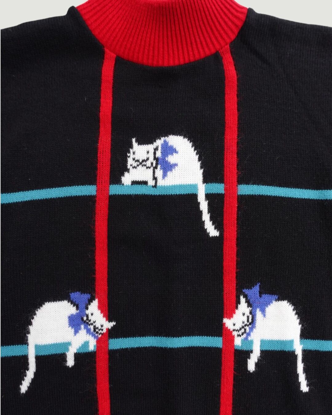 黒地に映える、ブルーのリボンをつけた白猫が、等間隔にちょこんと配置された一枚。