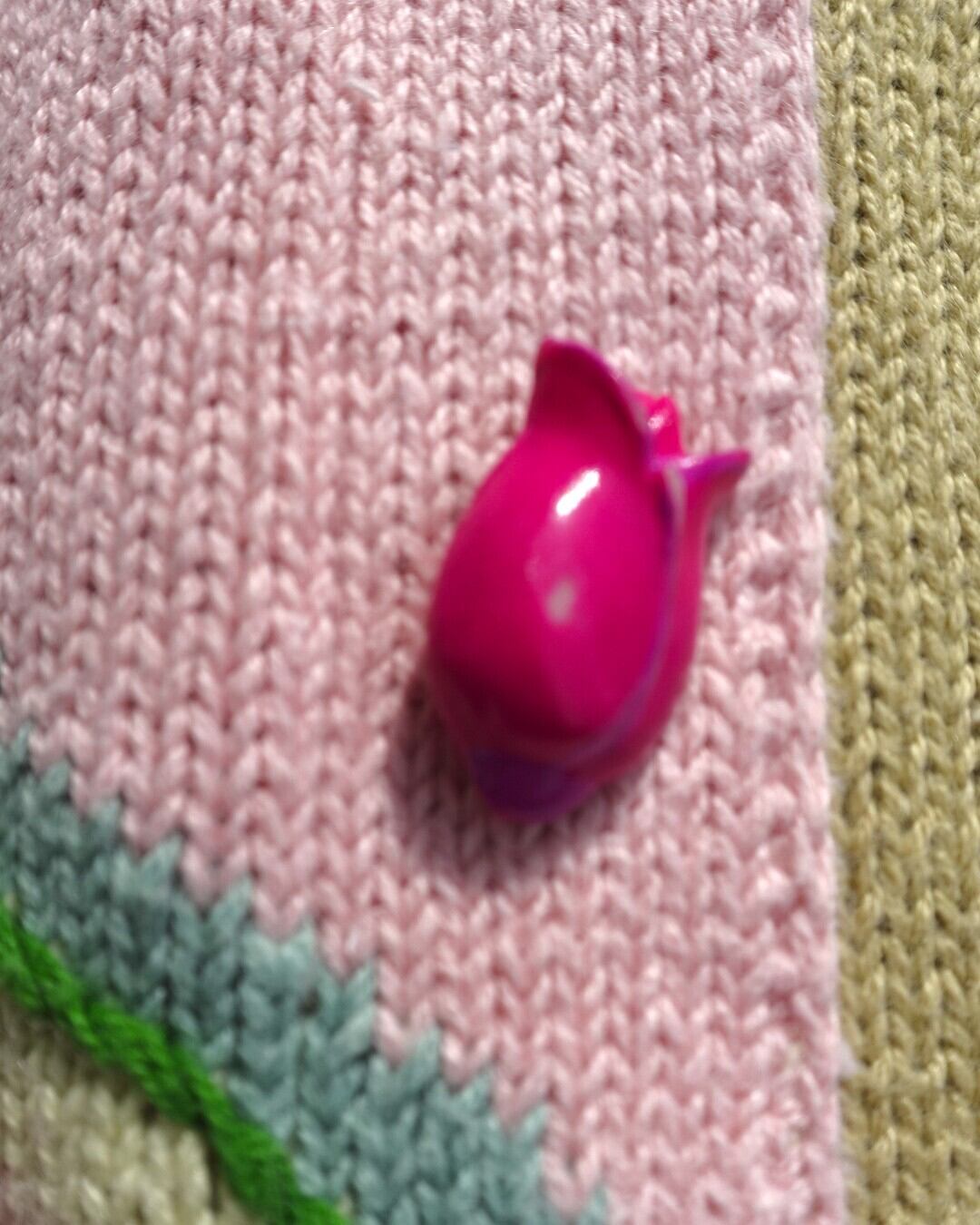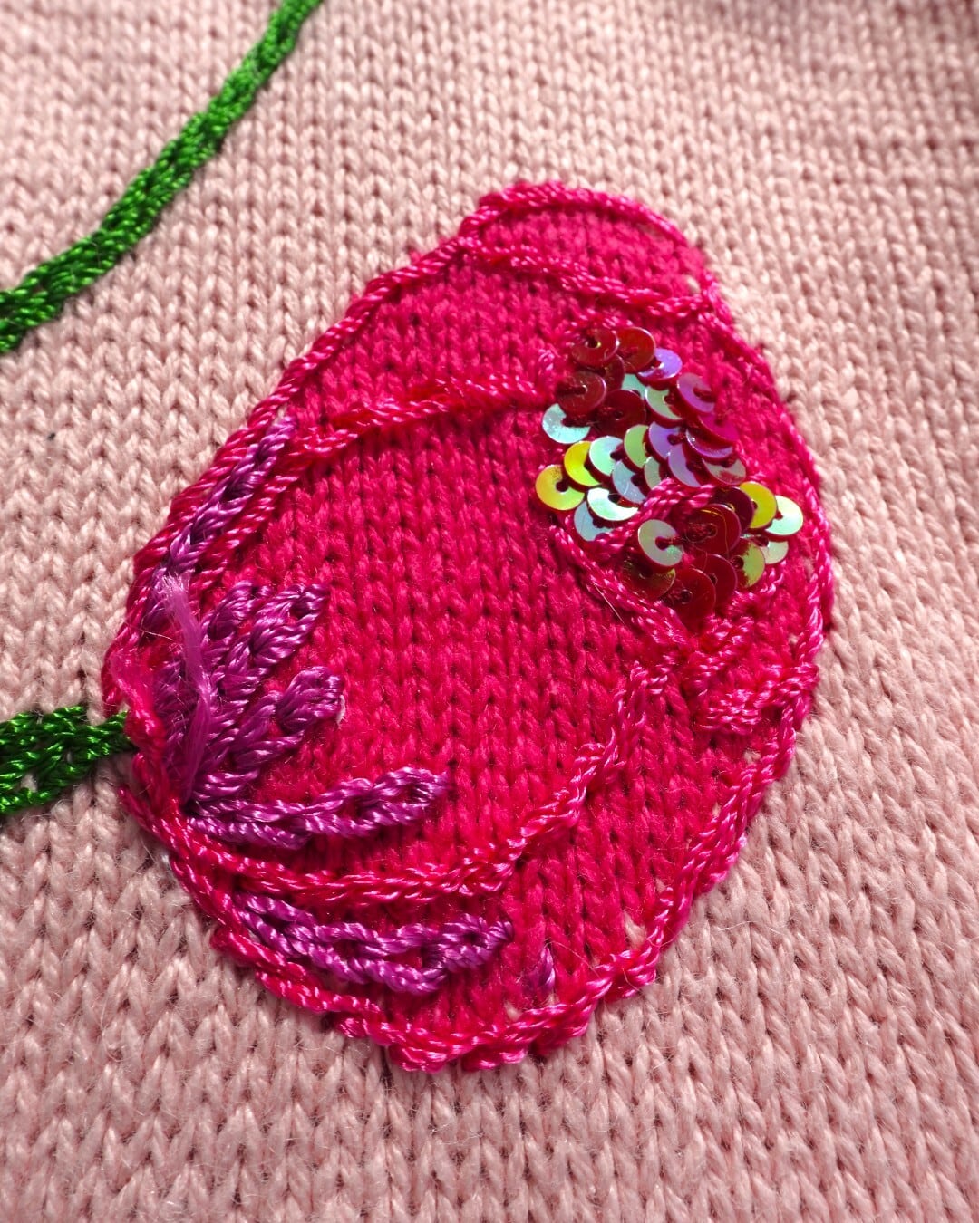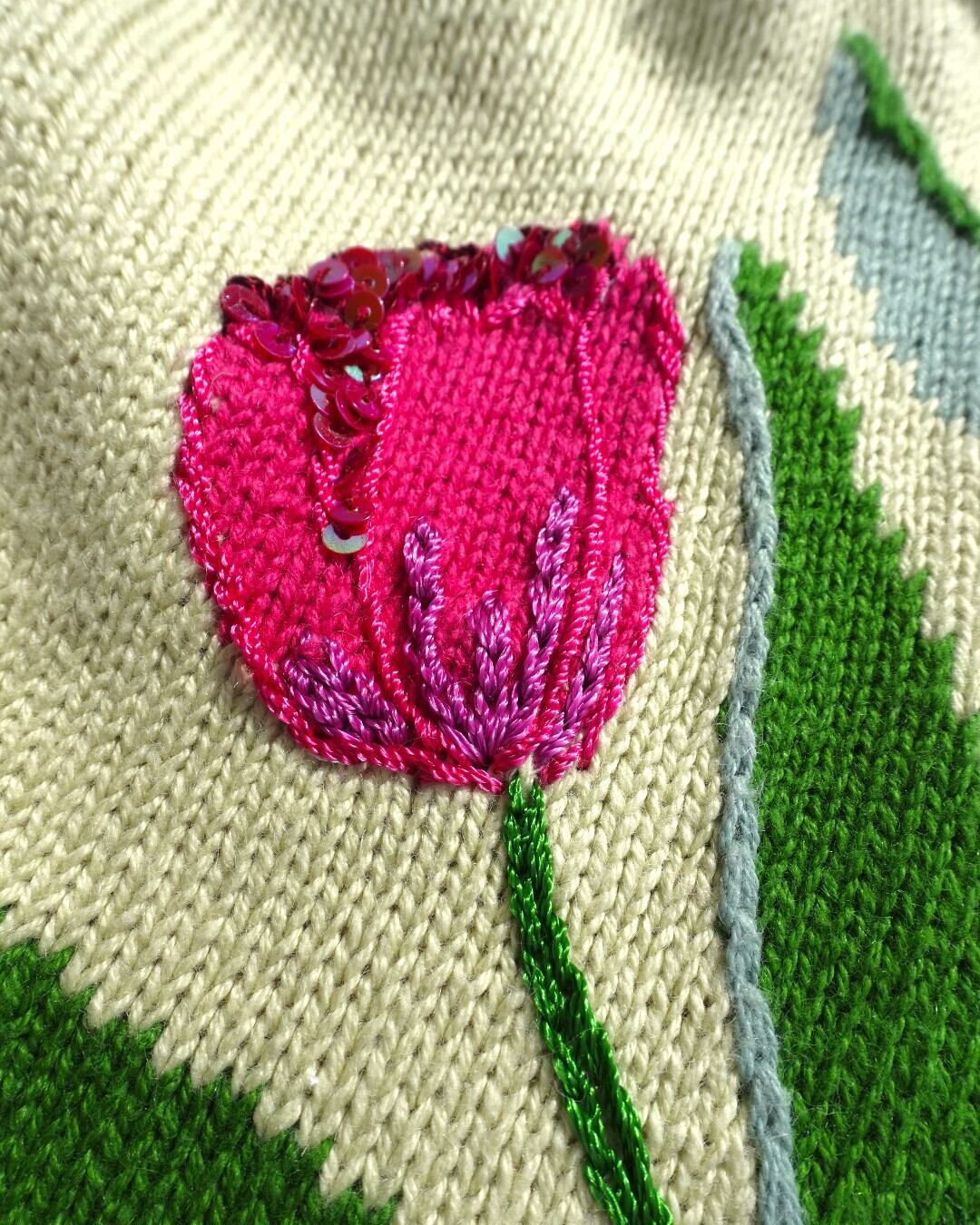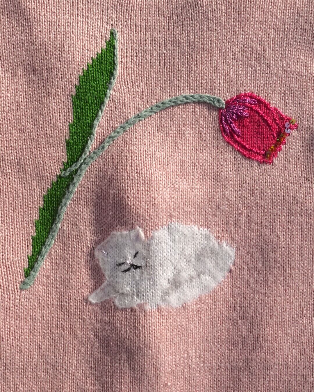 立体的な猫の毛並みや、つやっとしたピンクのボタン、花びらの刺繍まで細かくつくり込まれていて、ただ“かわいい”だけじゃない、手の込んだ一枚です。