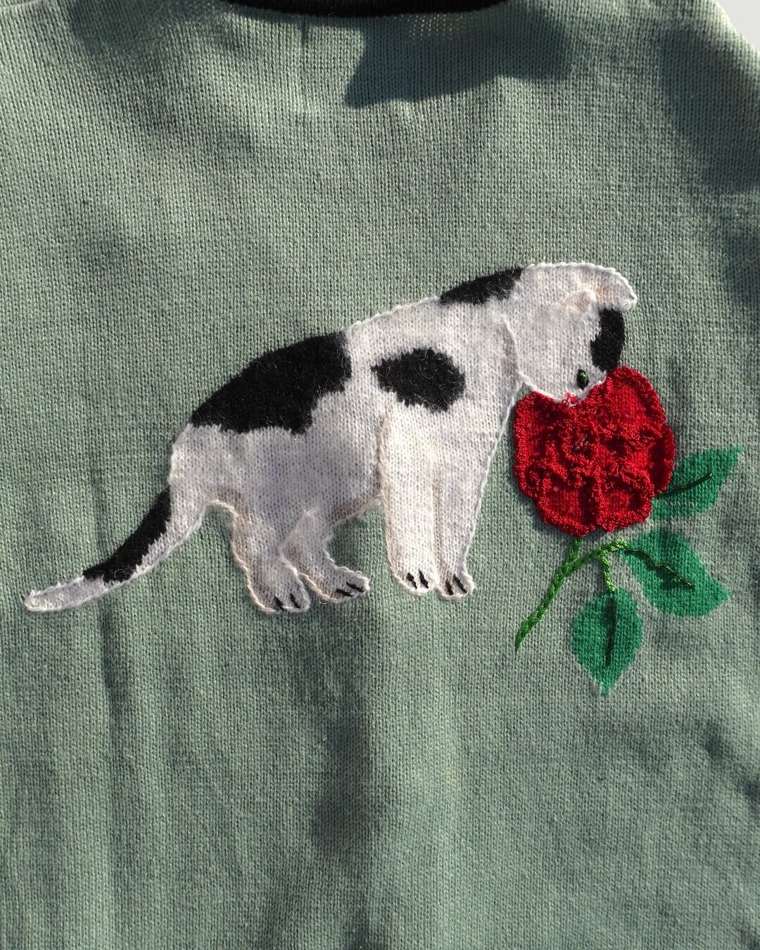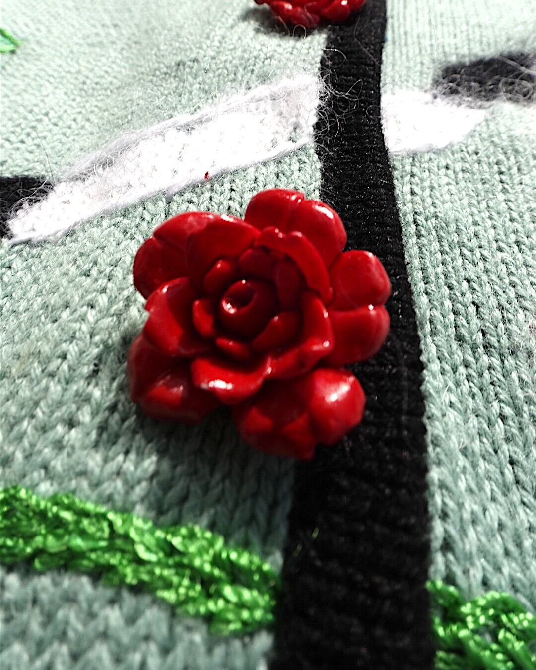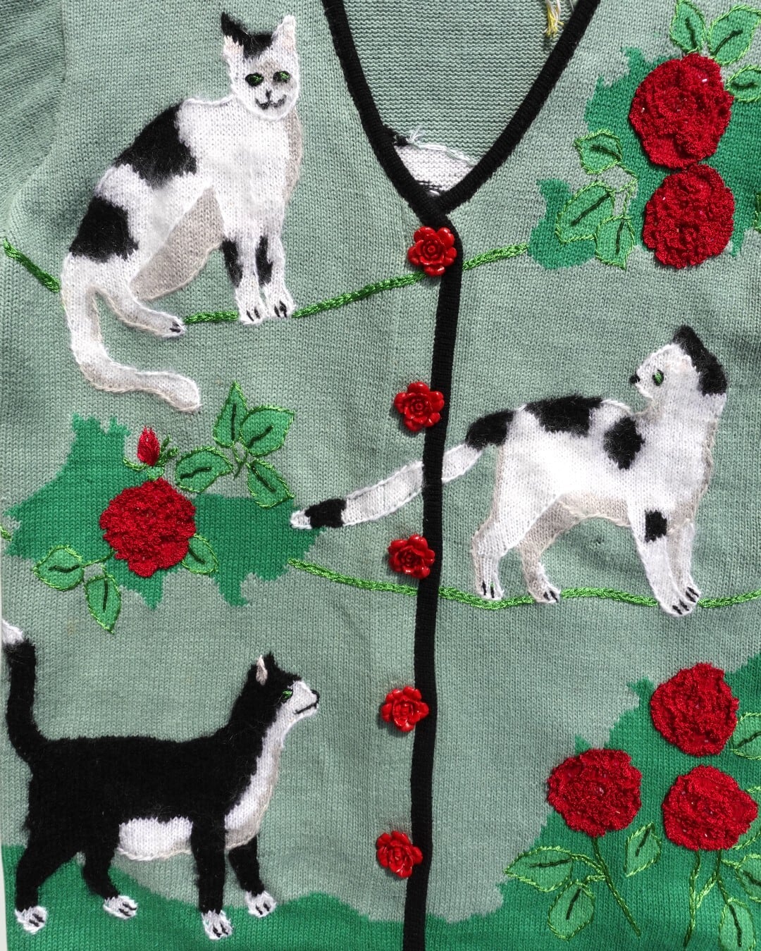 猫の毛並みはふんわりと立体感があり、バラはモコモコした刺繍で存在感たっぷり。さらに、赤いバラ型ボタンが中央に並ぶという抜かりなさ。