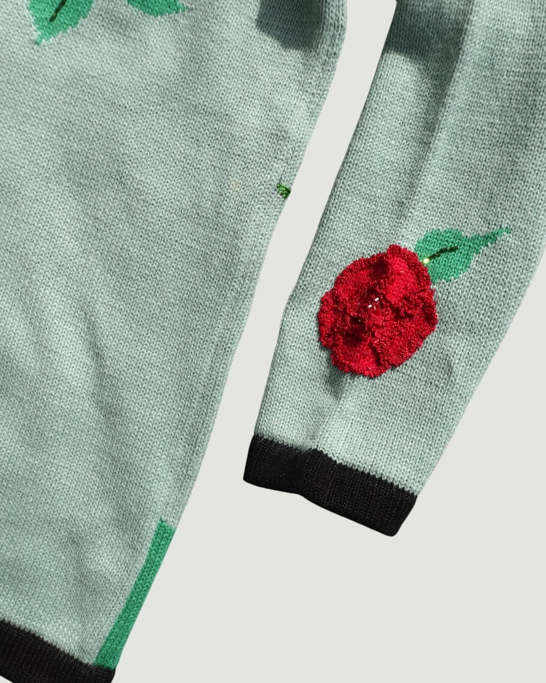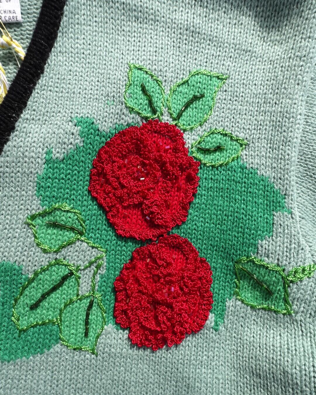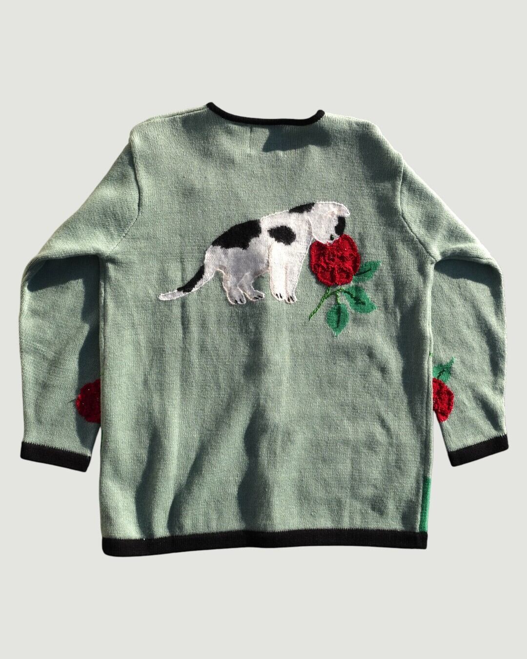 猫の毛並みはふんわりと立体感があり、バラはモコモコした刺繍で存在感たっぷり。さらに、赤いバラ型ボタンが中央に並ぶという抜かりなさ。
