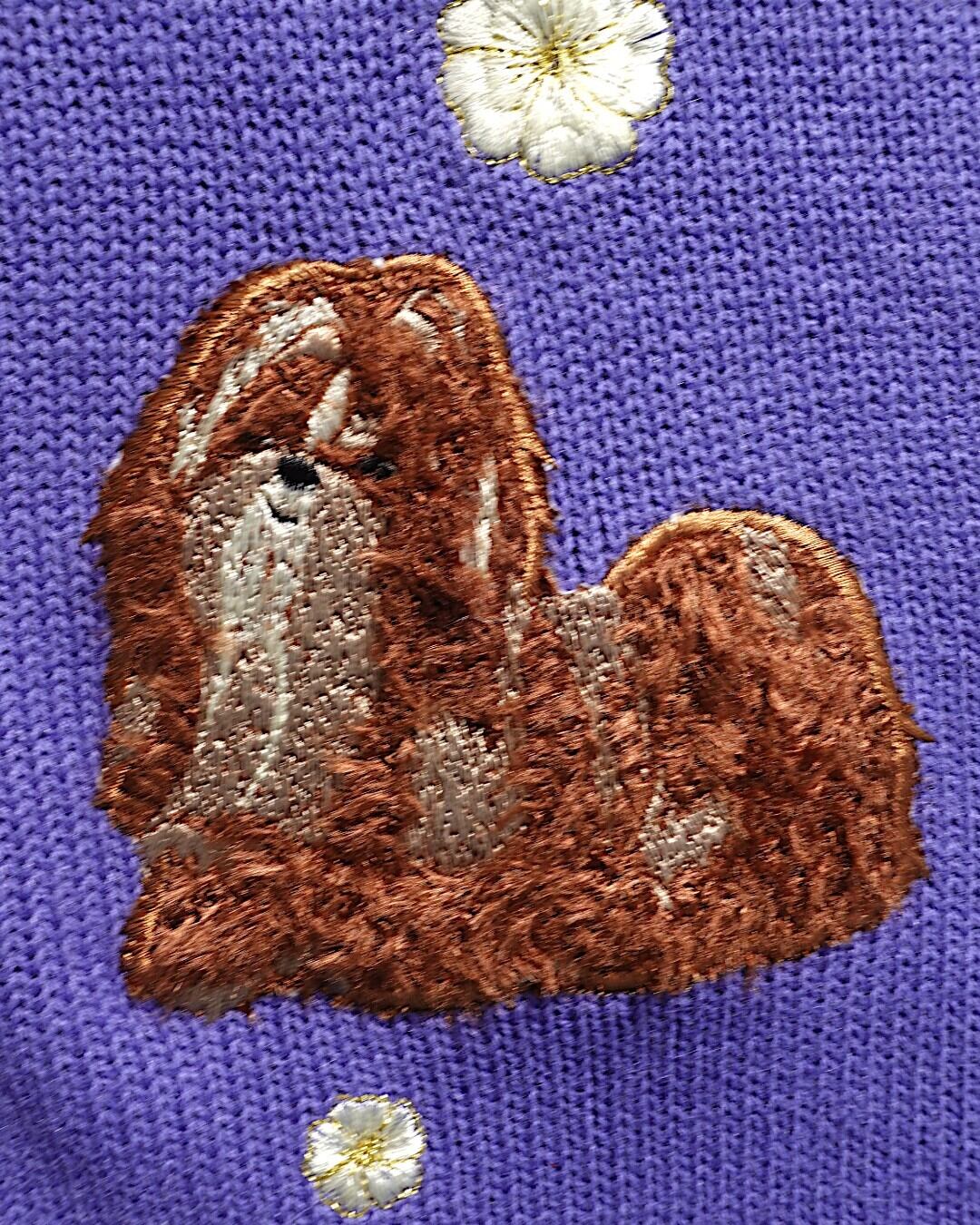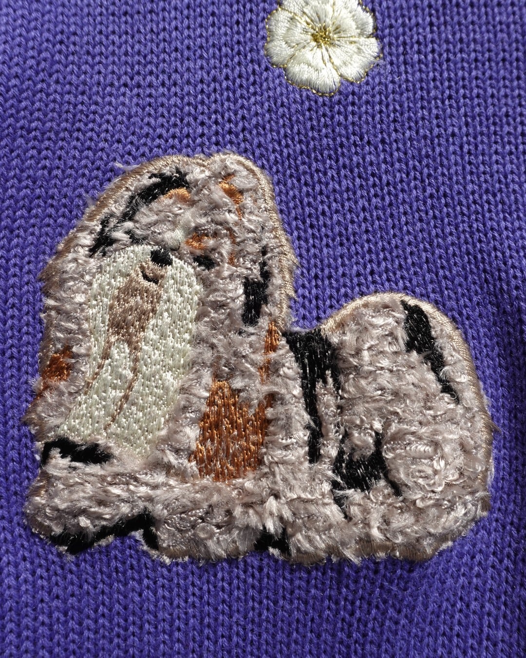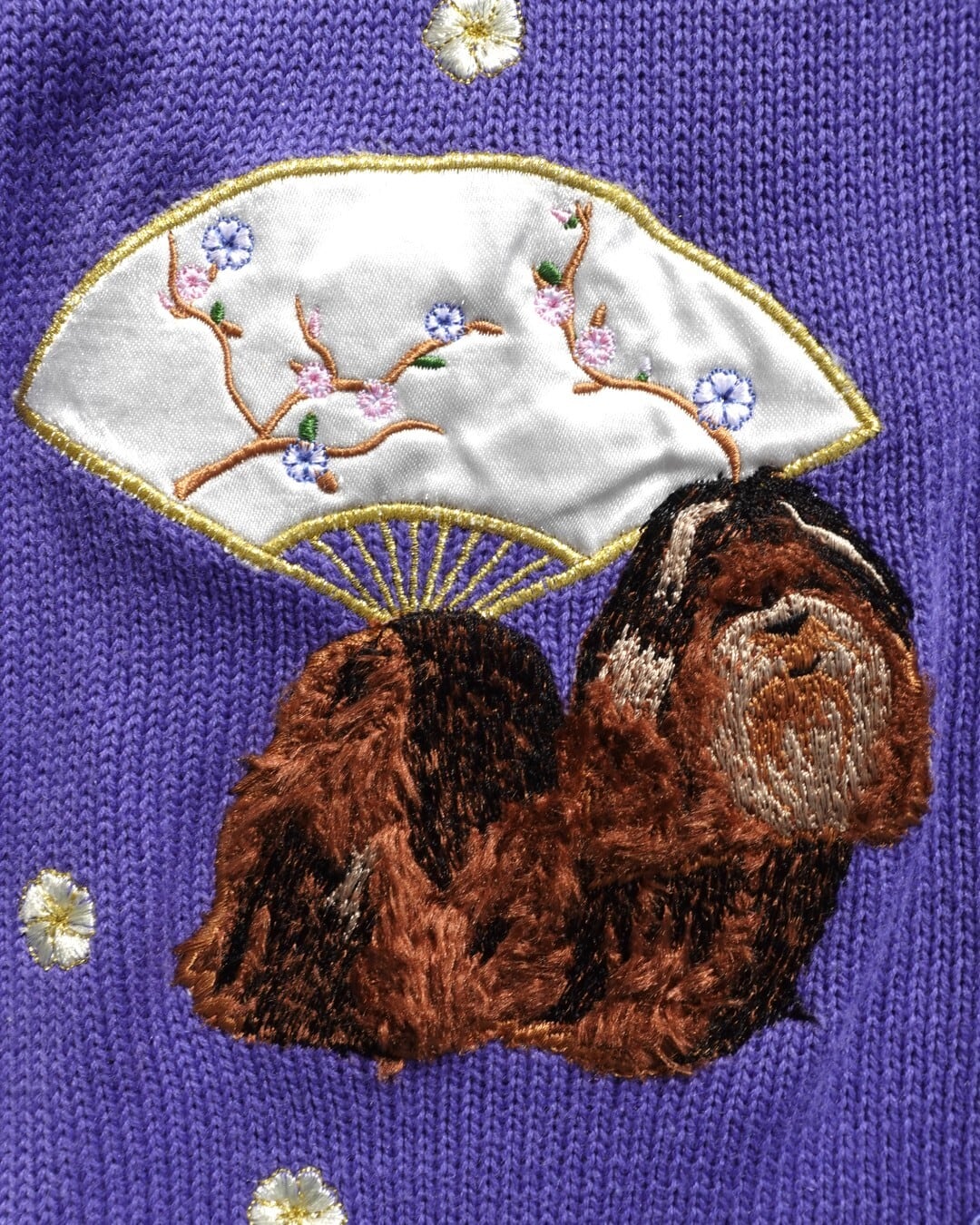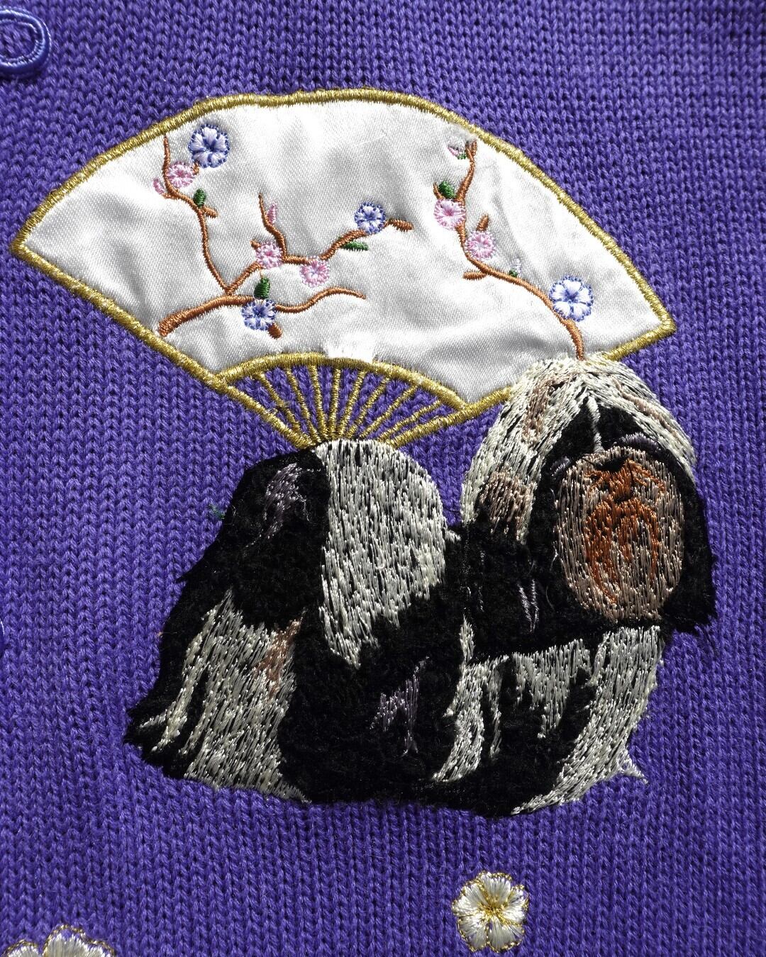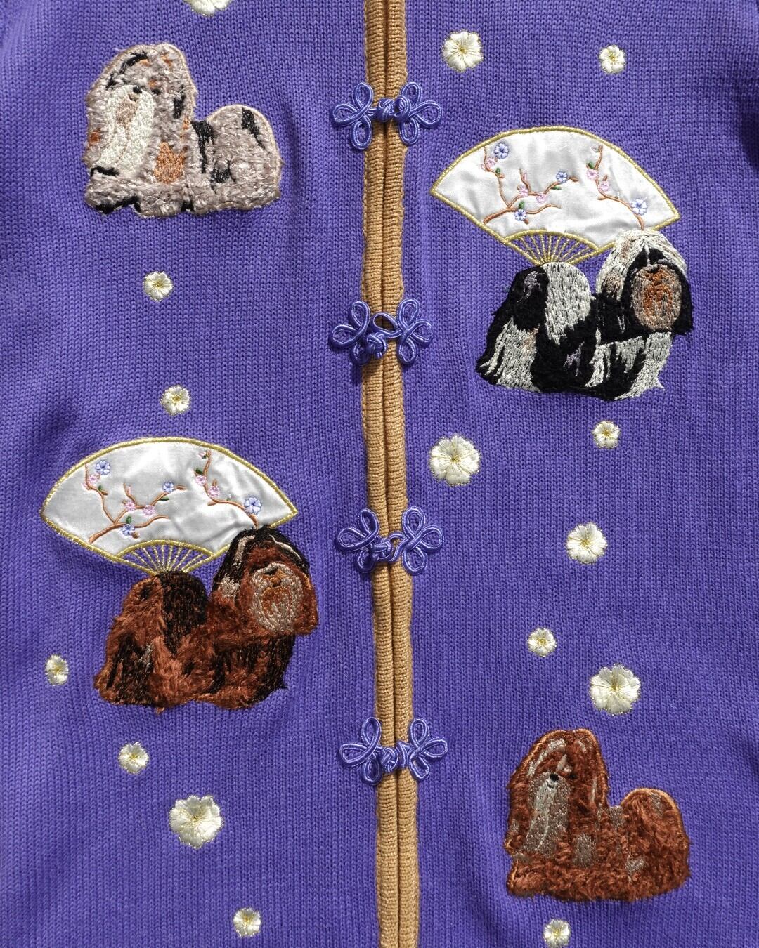 立体感ある刺繍で毛並みまで丁寧に表現された、4匹のシーズーがにこやかに座っている、犬好きにはたまらない一着。