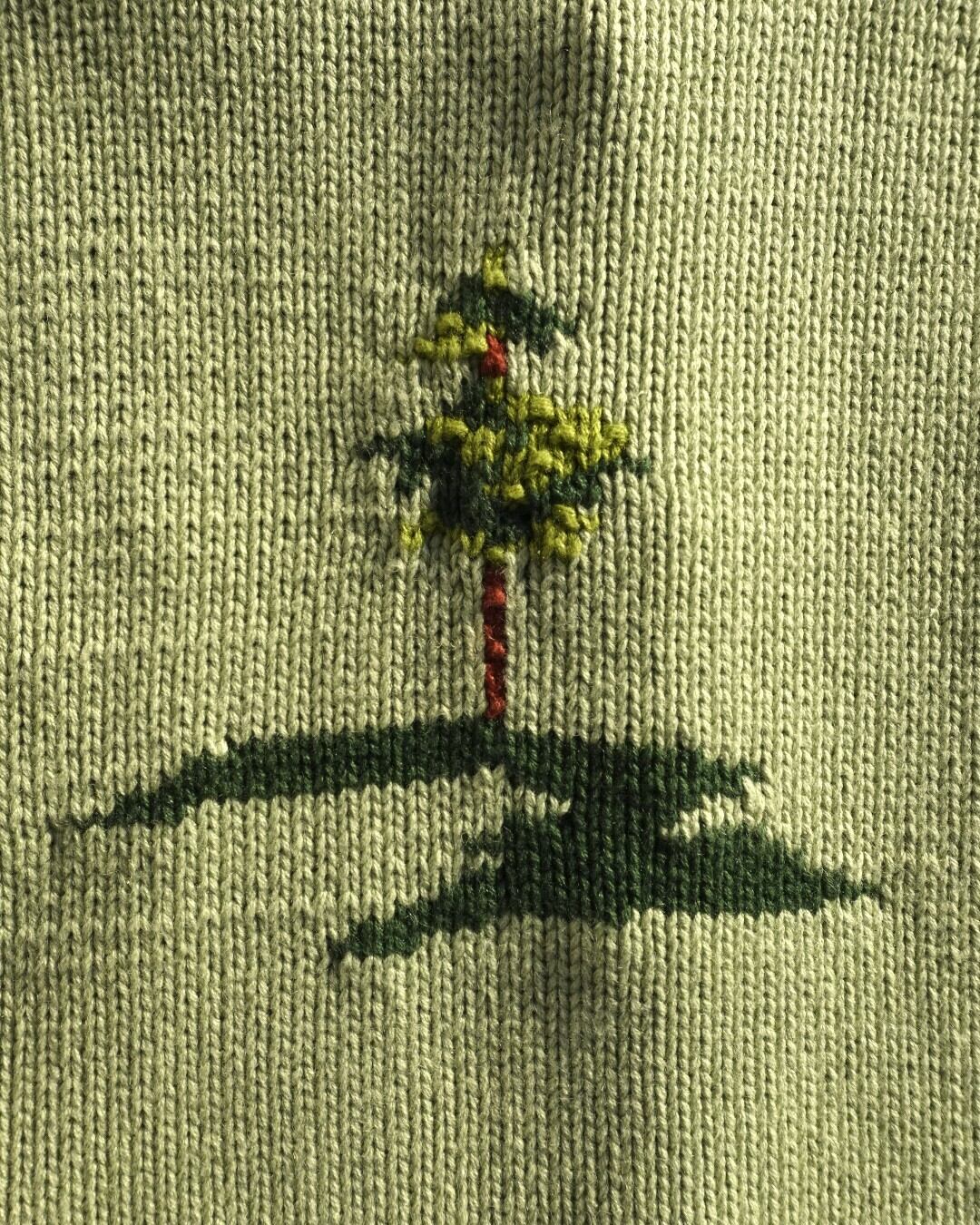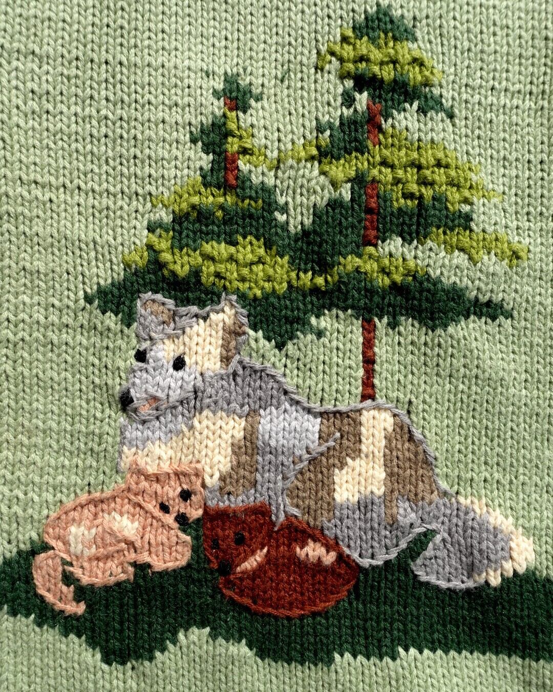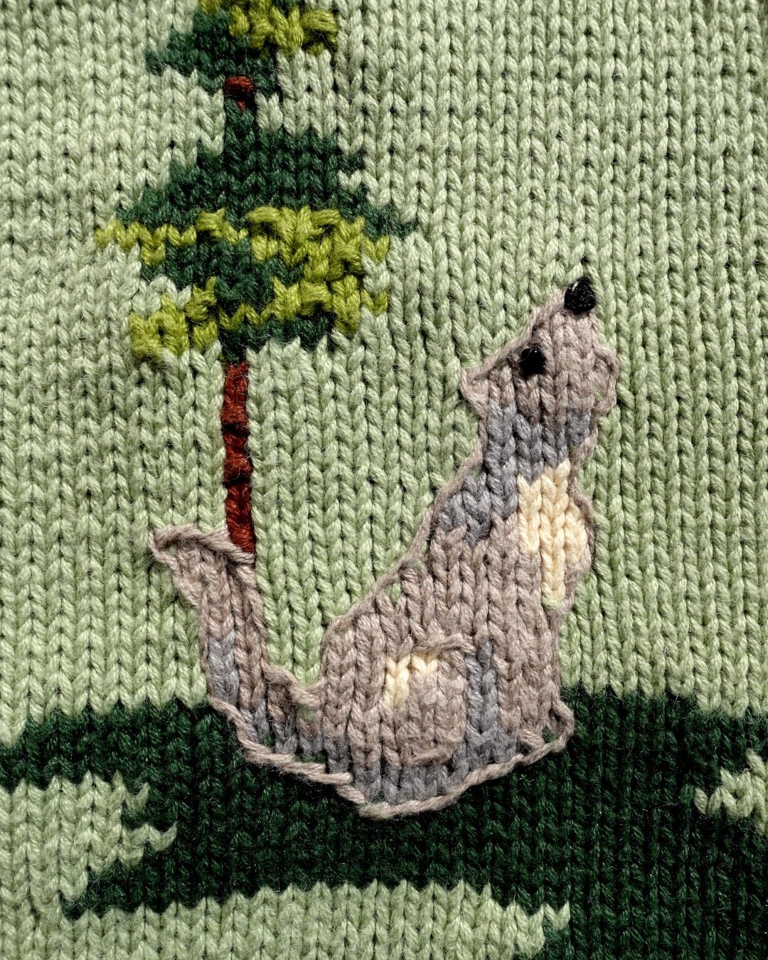 遠吠えする姿と、木陰で寄り添うシーンがニットで丁寧に表現されています。