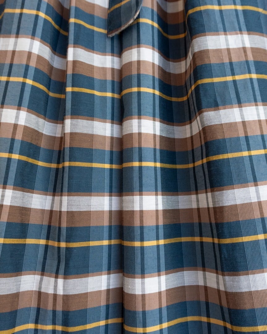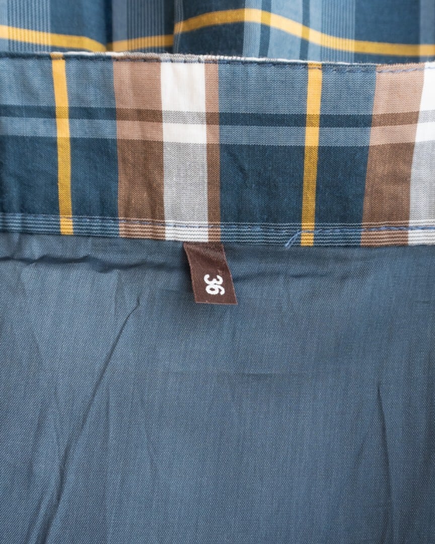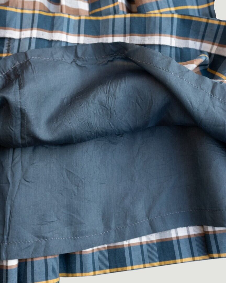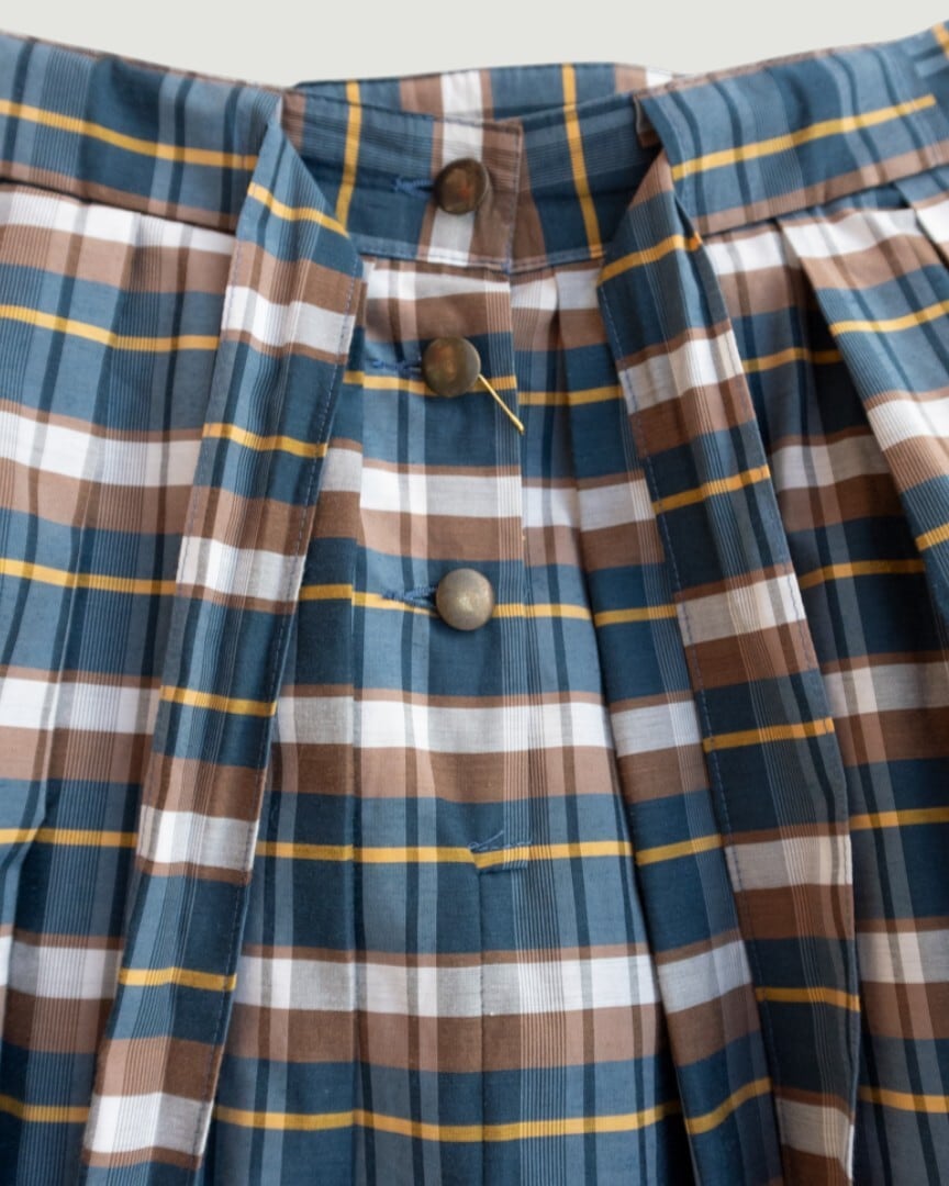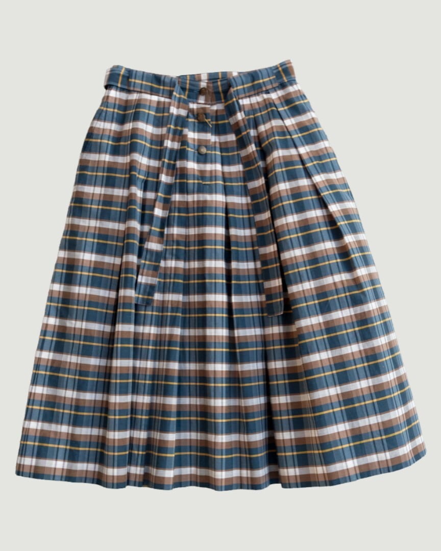 ブラウンとイエローのラインが効いたチェック柄スカート。