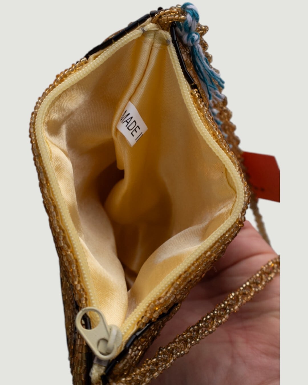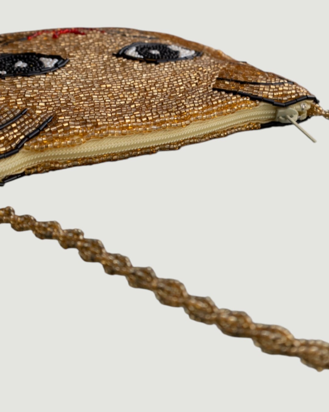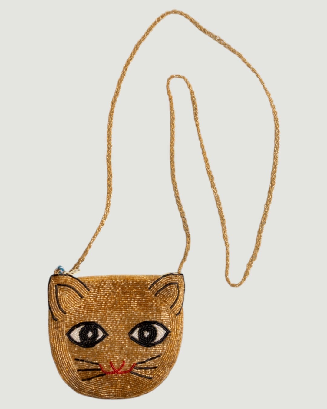 金のビーズでびっしり編み込まれた、猫モチーフのミニポシェット。肩紐までビーズで作り込まれていて、よく作ったなぁ。。ってつぶやいてしまうほど手の込んだ品です。